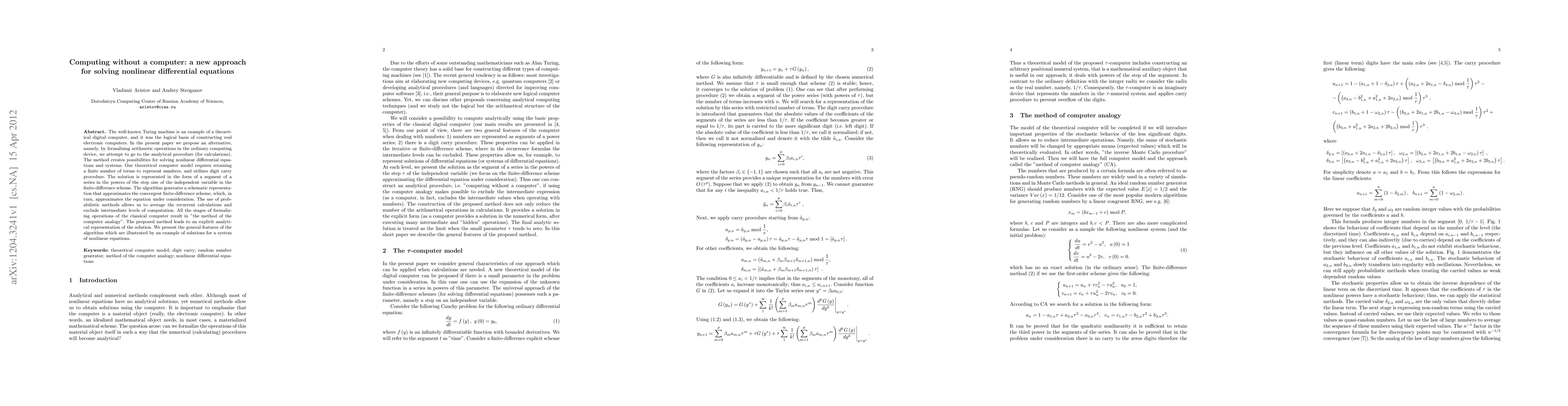 The well-known Turing machine is an example of a theoretical digital computer, and it was the logical basis of constructing real electronic computers. In the present paper we propose an alternative, namely, by formalising arithmetic operations in the ordinary computing device, we attempt to go to the analytical procedure (for calculations). The method creates possibilities for solving nonlinear differential equations and systems. Our theoretical computer model requires retaining a finite number of terms to represent numbers, and utilizes digit carry procedure. The solution is represented in the form of a segment of a series in the powers of the step size of the independent variable in the finite-difference scheme. The algorithm generates a schematic representation that approximates the convergent finite-difference scheme, which, in turn, approximates the equation under consideration. The use of probabilistic methods allows us to average the recurrent calculations and exclude intermediate levels of computation. All the stages of formalizing operations of the classical computer result in "the method of the computer analogy". The proposed method leads to an explicit analytical representation of the solution. We present the general features of the algorithm which are illustrated by an example of solutions for a system of nonlinear equations.