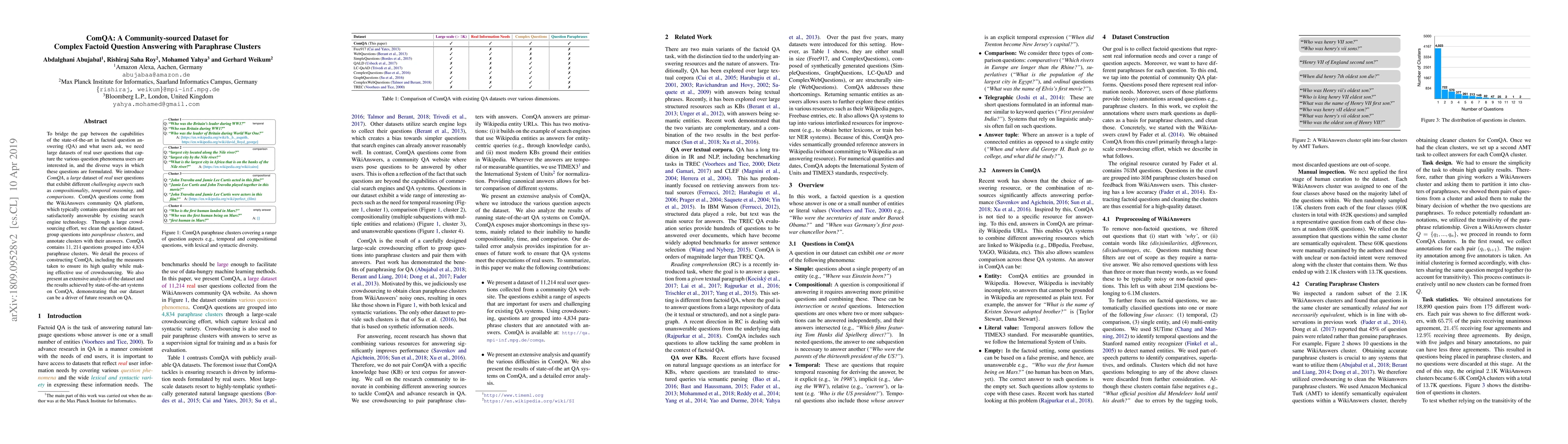 ComQA is a large dataset of real user questions sourced from WikiAnswers, designed to address complex factoid question answering challenges. It includes 11,214 questions grouped into 4,834 paraphrase clusters, aiming to improve state-of-the-art QA systems by capturing diverse question phenomena.