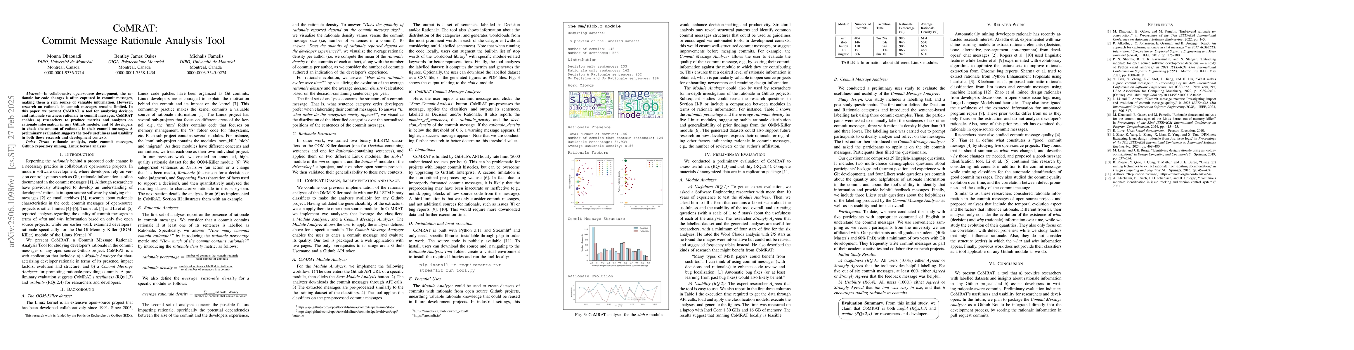 The paper introduces CoMRAT, a tool for analyzing rationale in commit messages, which aids researchers in producing metrics and analyses, and helps developers assess their commit message rationale. Initial evaluation indicates its usefulness and usability in both research and development contexts.