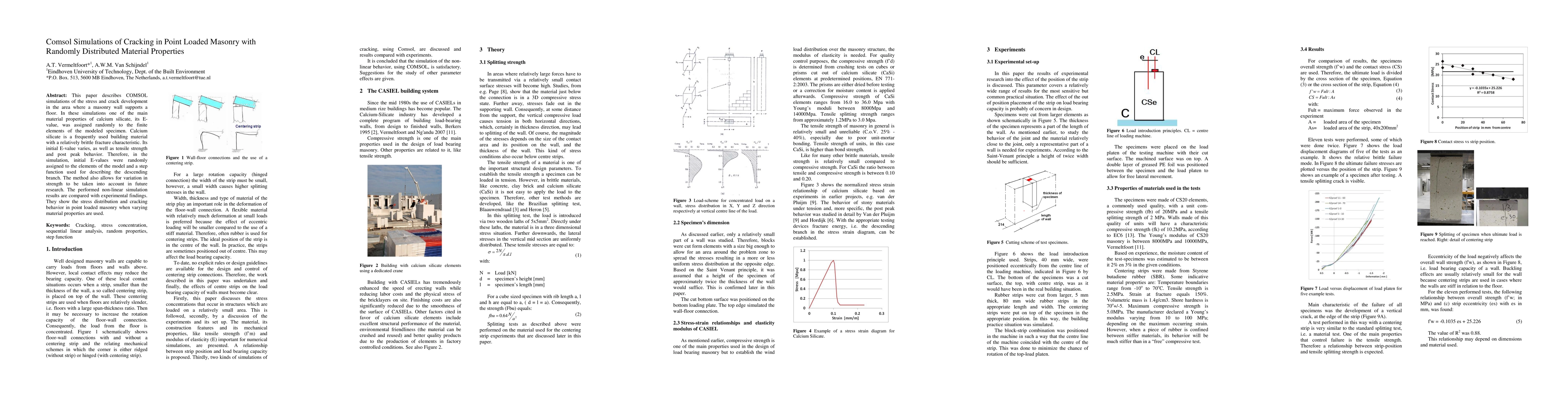 This paper uses COMSOL simulations to study stress and crack development in point-loaded masonry with randomly distributed calcium silicate material properties, comparing simulation results with experimental findings to understand stress distribution and cracking behavior. The method accounts for material variability and can be extended to include variations in strength.