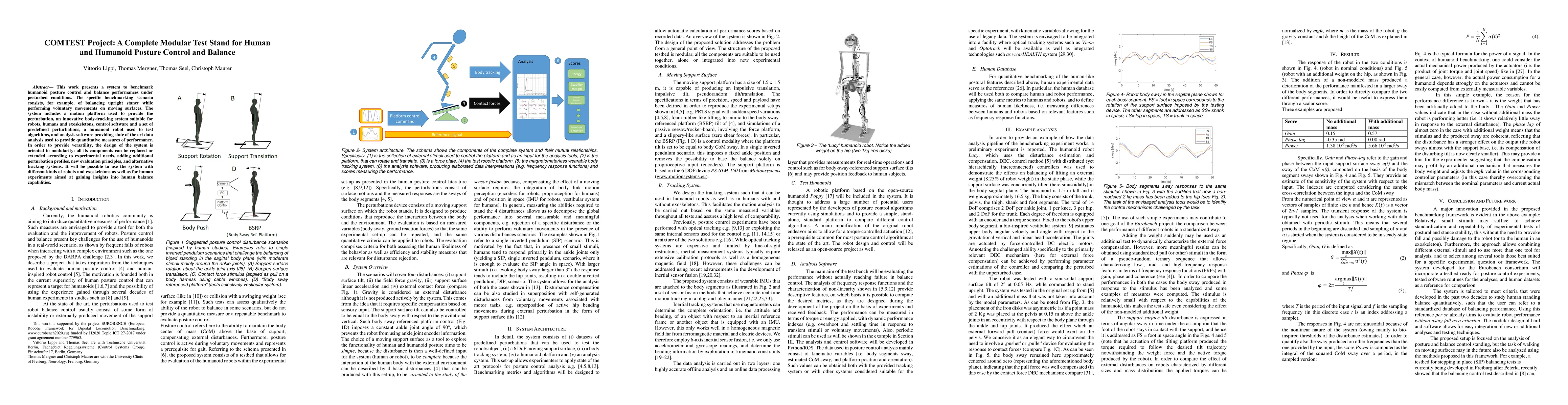 The COMTEST Project introduces a modular test stand for evaluating posture control and balance in humanoids and humans, featuring a motion platform, body-tracking system, and analysis software for quantitative performance measures, designed for versatility and extendibility across various robots and human experiments.