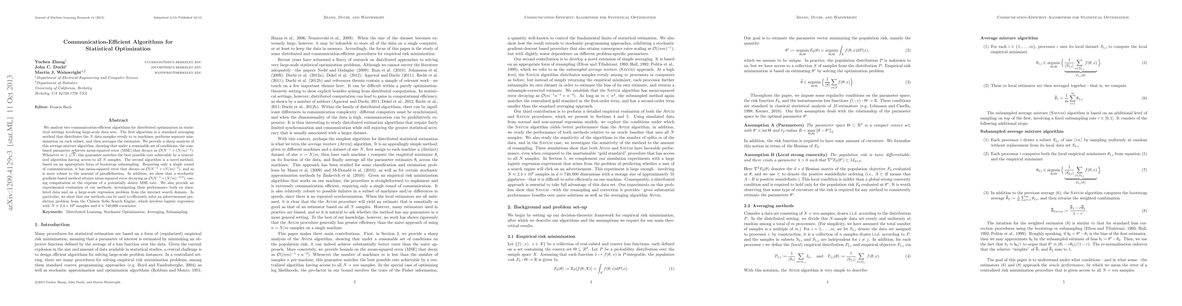 We analyze two communication-efficient algorithms for distributed statistical optimization on large-scale data sets. The first algorithm is a standard averaging method that distributes the $N$ data samples evenly to $\nummac$ machines, performs separate minimization on each subset, and then averages the estimates. We provide a sharp analysis of this average mixture algorithm, showing that under a reasonable set of conditions, the combined parameter achieves mean-squared error that decays as $\order(N^{-1}+(N/m)^{-2})$. Whenever $m \le \sqrt{N}$, this guarantee matches the best possible rate achievable by a centralized algorithm having access to all $\totalnumobs$ samples. The second algorithm is a novel method, based on an appropriate form of bootstrap subsampling. Requiring only a single round of communication, it has mean-squared error that decays as $\order(N^{-1} + (N/m)^{-3})$, and so is more robust to the amount of parallelization. In addition, we show that a stochastic gradient-based method attains mean-squared error decaying as $O(N^{-1} + (N/ m)^{-3/2})$, easing computation at the expense of penalties in the rate of convergence. We also provide experimental evaluation of our methods, investigating their performance both on simulated data and on a large-scale regression problem from the internet search domain. In particular, we show that our methods can be used to efficiently solve an advertisement prediction problem from the Chinese SoSo Search Engine, which involves logistic regression with $N \approx 2.4 \times 10^8$ samples and $d \approx 740,000$ covariates.