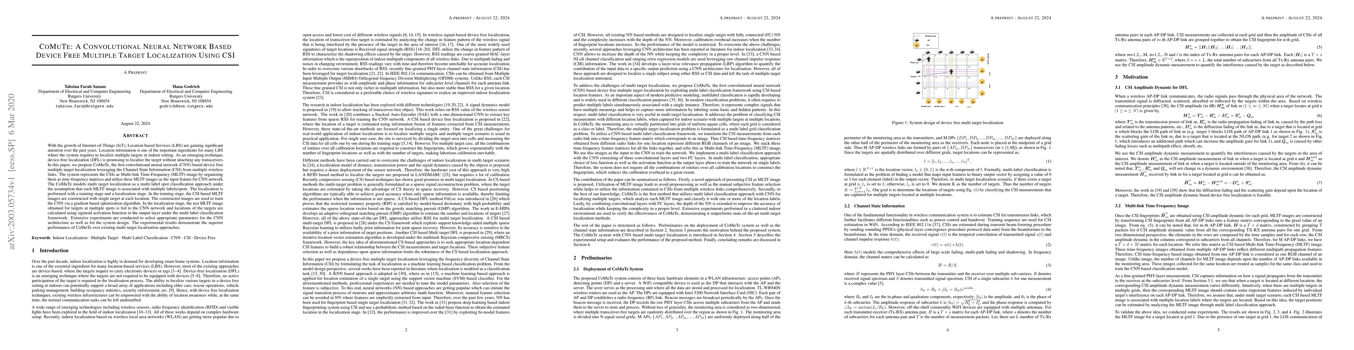 CoMuTe proposes a novel convolutional neural network (CNN) based method for device-free localization of multiple targets using Channel State Information (CSI) from wireless links. The system transforms CSI data into Multi-link Time-Frequency images and employs CNN for multi-label spot classification, achieving superior performance over existing methods.