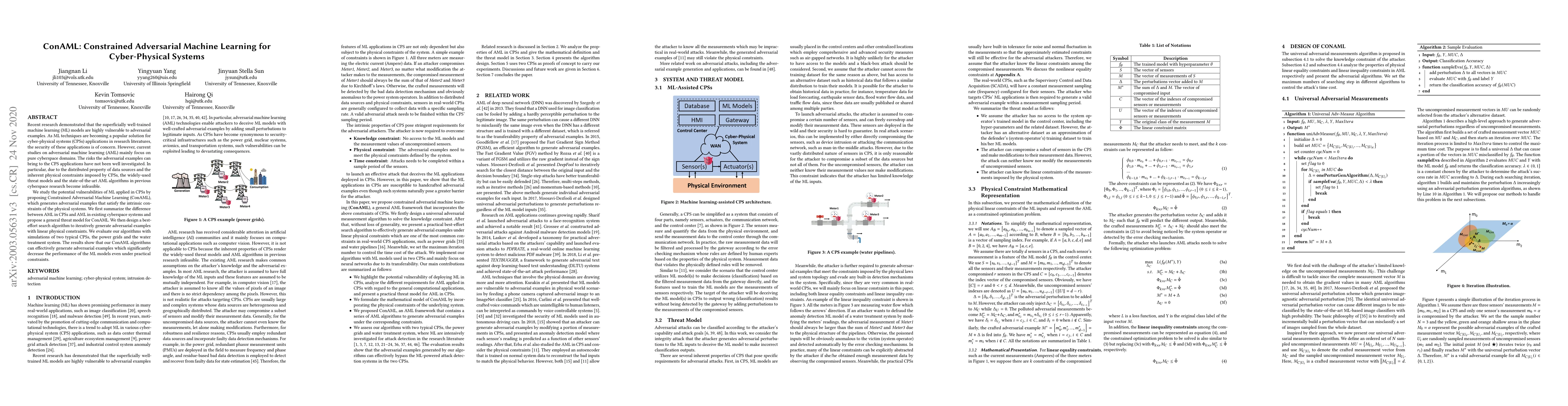 The paper introduces Constrained Adversarial Machine Learning (ConAML) to address the vulnerabilities of machine learning models in cyber-physical systems, which differ from those in cyberspace due to physical constraints. The study proposes a novel threat model and algorithm for generating adversarial examples that respect these constraints, demonstrating its effectiveness through simulations in power grids and water treatment systems.