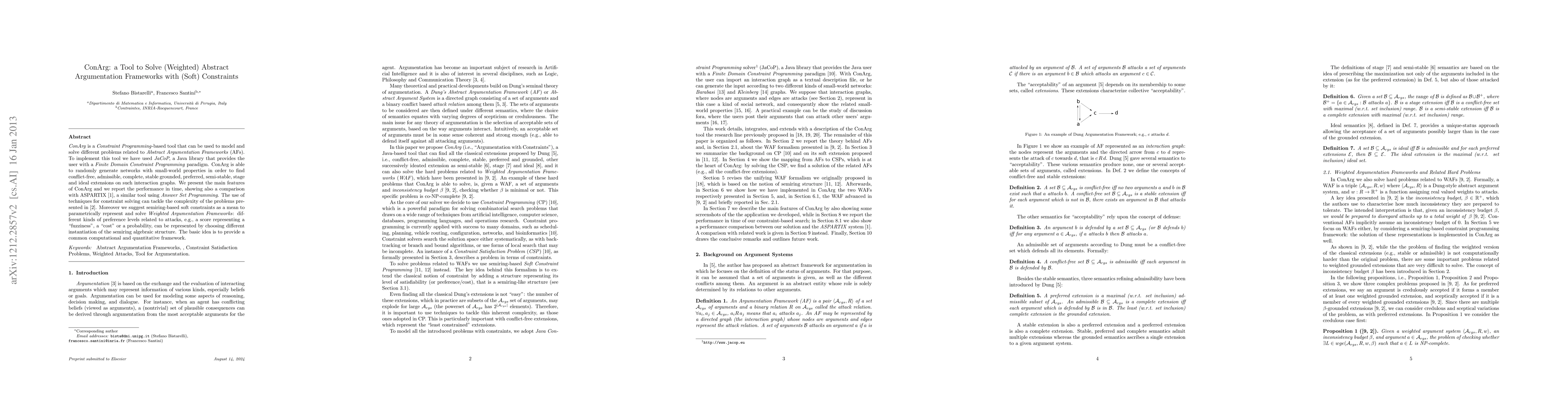 ConArg is a Constraint Programming-based tool for solving Abstract Argumentation Frameworks with soft constraints, implemented using JaCoP. It can generate small-world networks and compute various stable extensions, and compares favorably to ASPARTIX in performance.