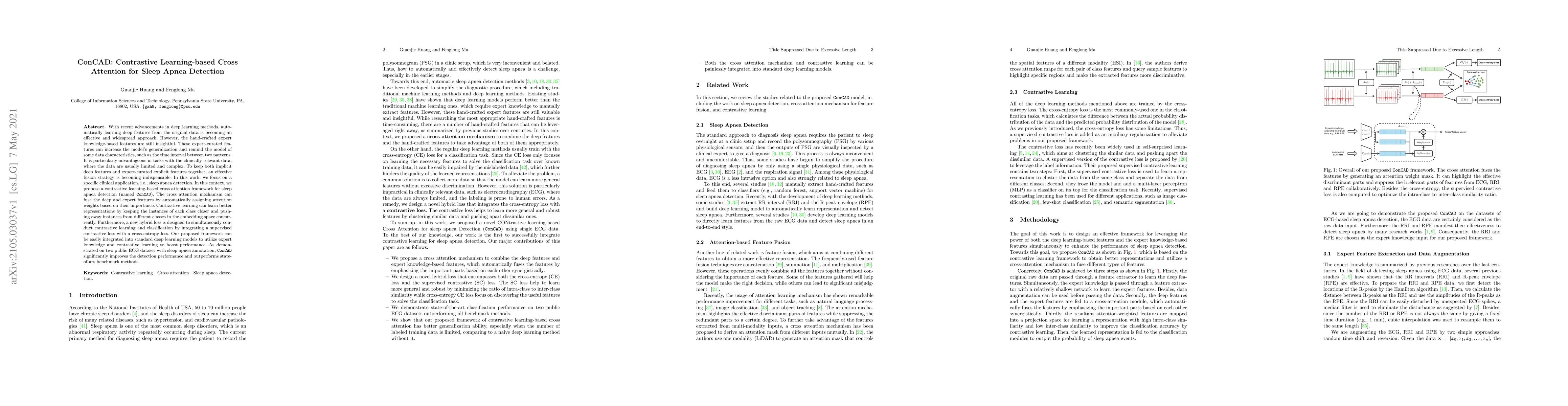 The paper proposes ConCAD, a contrastive learning-based cross attention framework for sleep apnea detection. It fuses deep and expert features using a cross attention mechanism and a hybrid loss combining contrastive learning with cross-entropy loss.