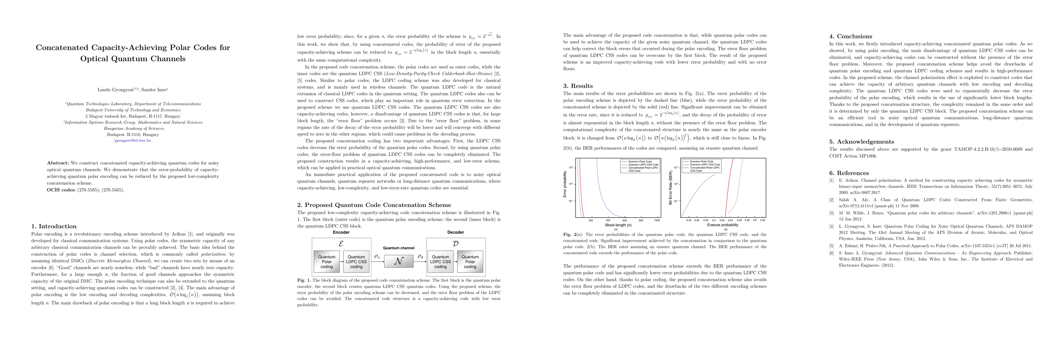 We construct concatenated capacity-achieving quantum codes for noisy optical quantum channels. We demonstrate that the error-probability of capacity-achieving quantum polar encoding can be reduced by the proposed low-complexity concatenation scheme.