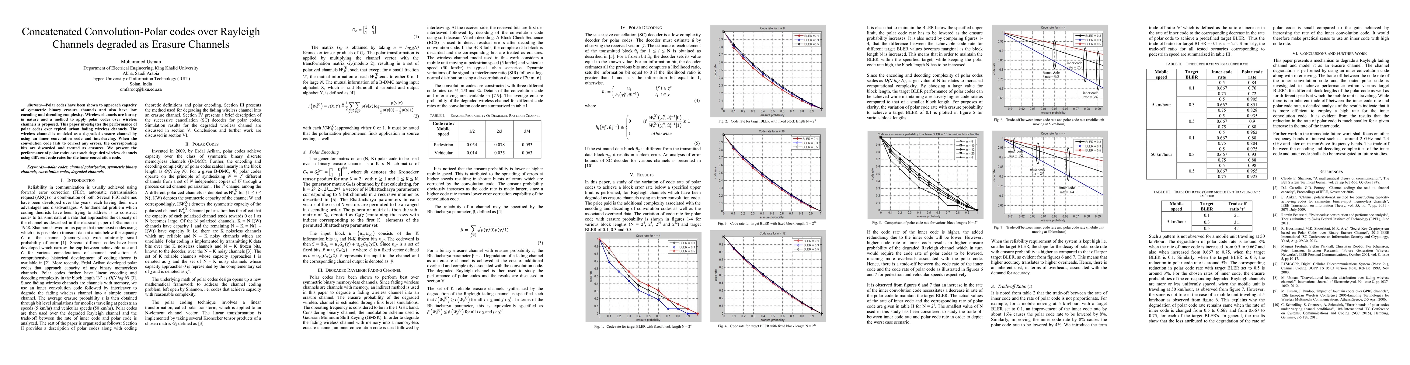 This paper explores the application of polar codes over urban fading wireless channels, modeled as degraded erasure channels using concatenated convolution codes and interleaving. It evaluates the performance of polar codes under various inner convolution code rates.