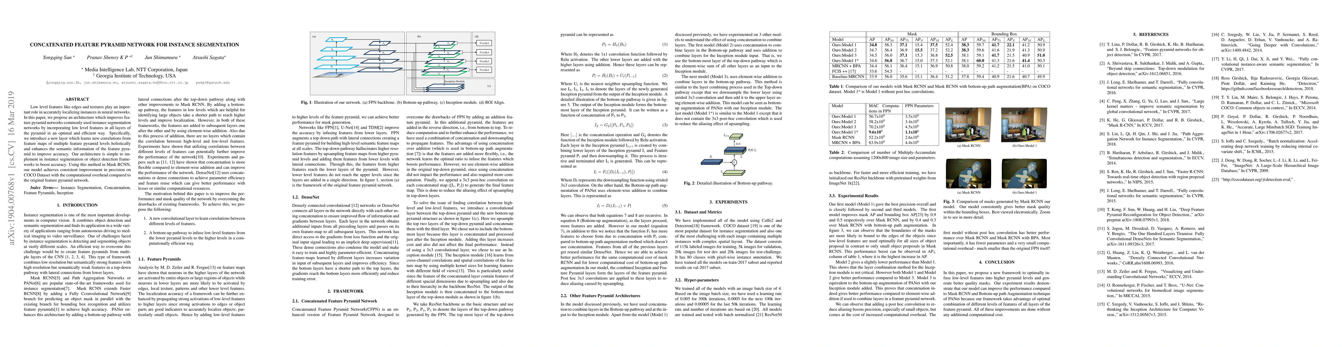 This paper proposes a Concatenated Feature Pyramid Network to enhance instance segmentation by integrating low-level features into all pyramid layers. The new architecture improves semantic information and boosts accuracy in Mask RCNN, achieving consistent precision gains on the COCO Dataset with minimal computational overhead.
