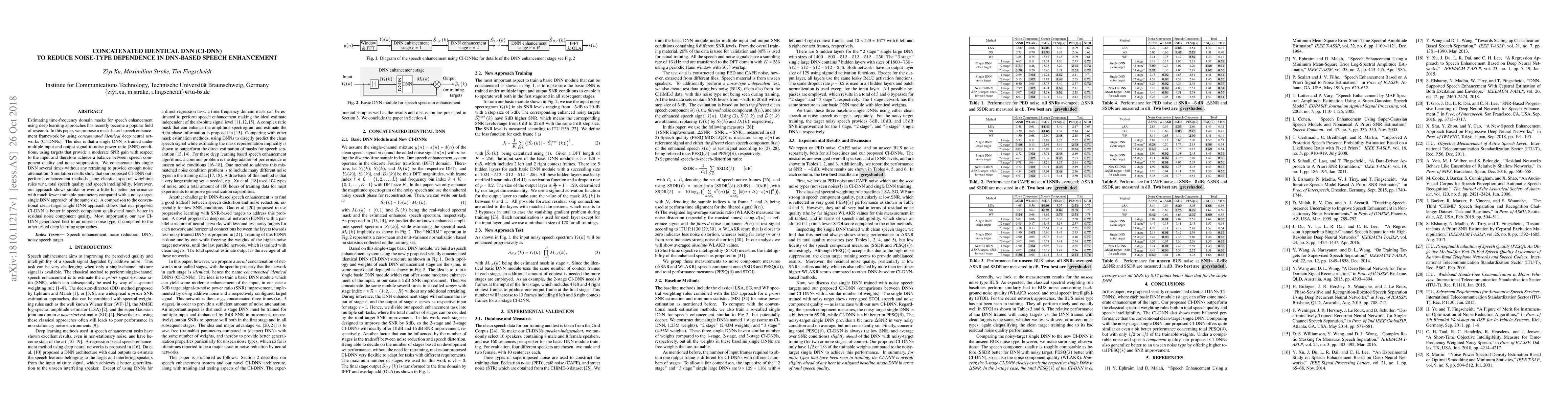 This paper proposes a concatenated identical deep neural network (CI-DNN) for speech enhancement that trains a single DNN under various SNR conditions to balance speech quality and noise suppression. The CI-DNN, which uses multiple concatenations without retraining, outperforms traditional methods in speech quality and intelligibility while requiring fewer parameters and generalizing better to unseen noise types.