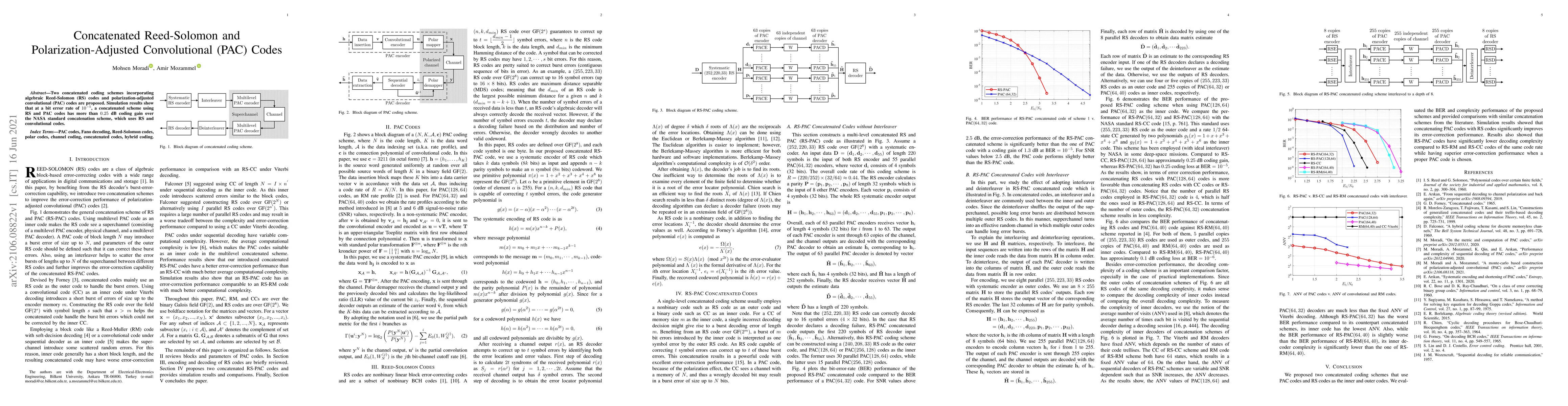Two concatenated coding schemes incorporating algebraic Reed-Solomon (RS) codes and polarization-adjusted convolutional (PAC) codes are proposed. Simulation results show that at a bit error rate of $10^{-5}$, a concatenated scheme using RS and PAC codes has more than $0.25$ dB coding gain over the NASA standard concatenation scheme, which uses RS and convolutional codes.