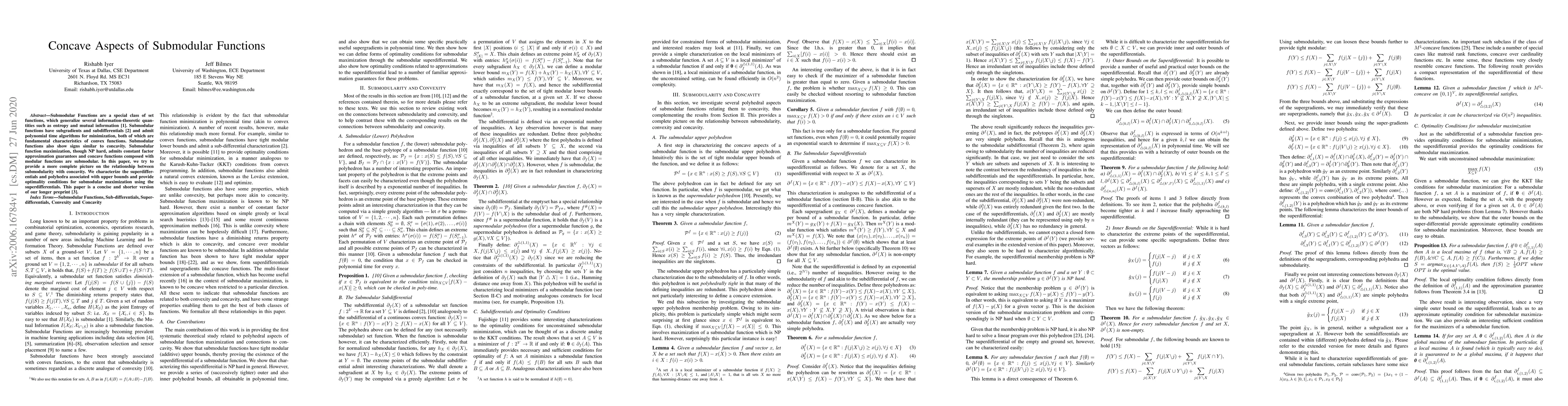 Submodular Functions are a special class of set functions, which generalize several information-theoretic quantities such as entropy and mutual information [1]. Submodular functions have subgradients and subdifferentials [2] and admit polynomial-time algorithms for minimization, both of which are fundamental characteristics of convex functions. Submodular functions also show signs similar to concavity. Submodular function maximization, though NP-hard, admits constant-factor approximation guarantees, and concave functions composed with modular functions are submodular. In this paper, we try to provide a more complete picture of the relationship between submodularity with concavity. We characterize the super-differentials and polyhedra associated with upper bounds and provide optimality conditions for submodular maximization using the-super differentials. This paper is a concise and shorter version of our longer preprint [3].