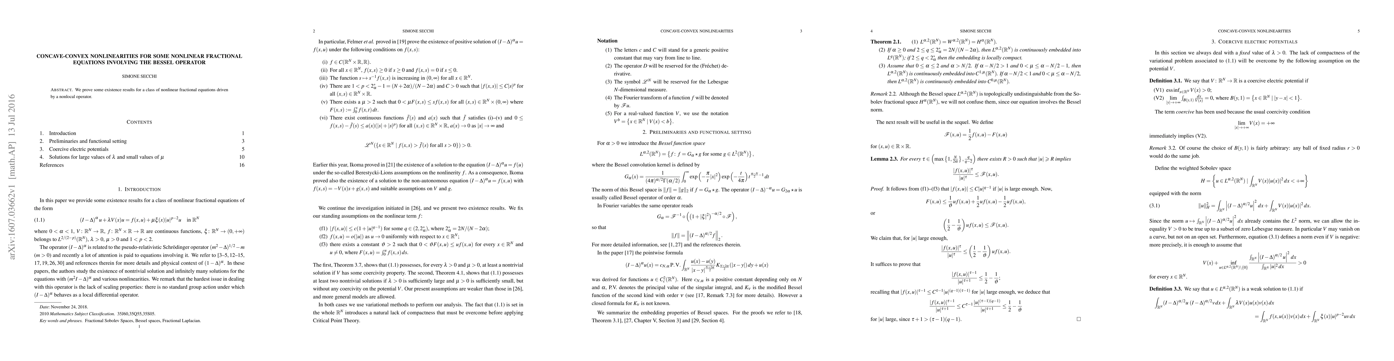 Summary: This paper establishes existence results for a class of nonlinear fractional equations governed by a nonlocal operator, utilizing concave-convex nonlinearities and the Bessel operator. The methodology highlights the interplay between fractional calculus and nonlinear analysis.