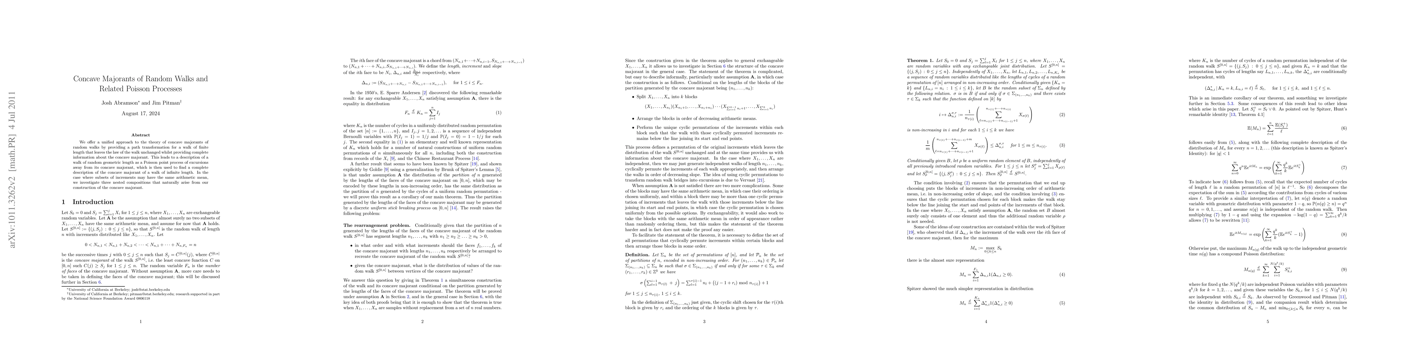 We offer a unified approach to the theory of concave majorants of random walks by providing a path transformation for a walk of finite length that leaves the law of the walk unchanged whilst providing complete information about the concave majorant. This leads to a description of a walk of random geometric length as a Poisson point process of excursions away from its concave majorant, which is then used to find a complete description of the concave majorant for a walk of infinite length. In the case where subsets of increments may have the same arithmetic mean, we investigate three nested compositions that naturally arise from our construction of the concave majorant.