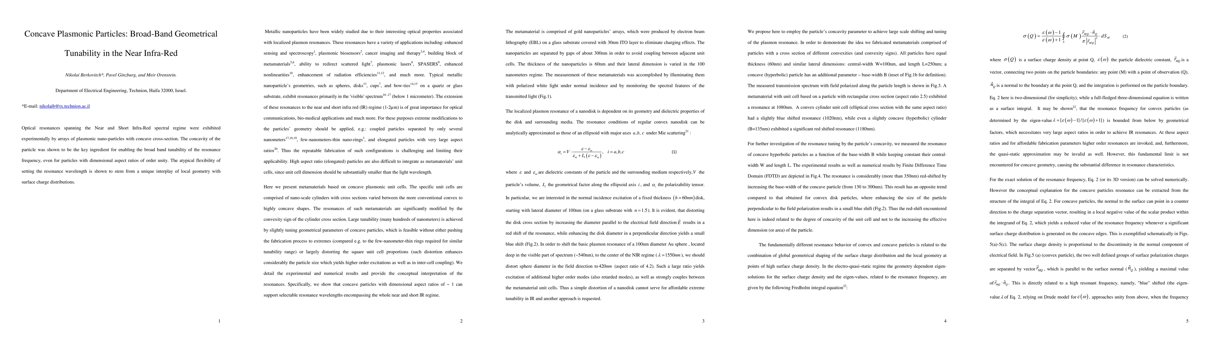 Optical resonances spanning the Near and Short Infra-Red spectral regime were exhibited experimentally by arrays of plasmonic nano-particles with concave cross-section. The concavity of the particle was shown to be the key ingredient for enabling the broad band tunability of the resonance frequency, even for particles with dimensional aspect ratios of order unity. The atypical flexibility of setting the resonance wavelength is shown to stem from a unique interplay of local geometry with surface charge distributions.
