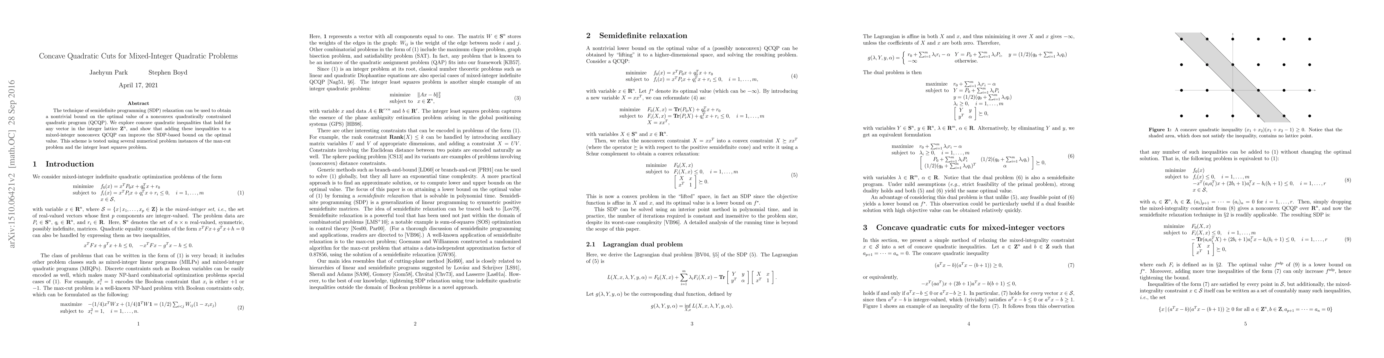 The technique of semidefinite programming (SDP) relaxation can be used to obtain a nontrivial bound on the optimal value of a nonconvex quadratically constrained quadratic program (QCQP). We explore concave quadratic inequalities that hold for any vector in the integer lattice ${\bf Z}^n$, and show that adding these inequalities to a mixed-integer nonconvex QCQP can improve the SDP-based bound on the optimal value. This scheme is tested using several numerical problem instances of the max-cut problem and the integer least squares problem.