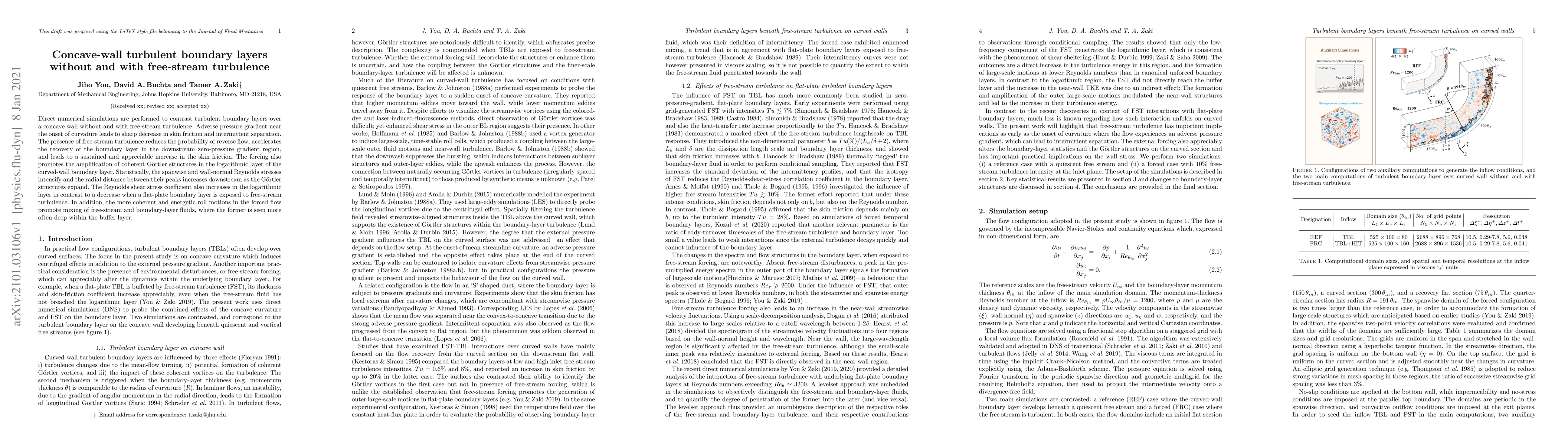 Direct numerical simulations reveal that free-stream turbulence enhances skin friction and reduces separation in concave-wall turbulent boundary layers, while also amplifying Görtler vortices and increasing Reynolds shear stress.