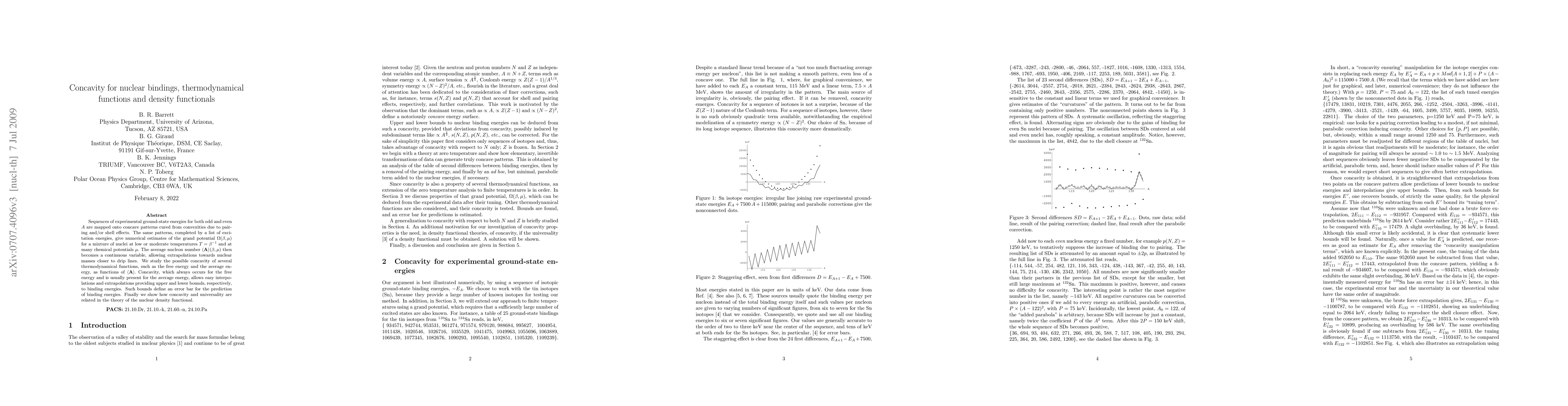 Sequences of experimental ground-state energies for both odd and even $A$ are mapped onto concave patterns cured from convexities due to pairing and/or shell effects. The same patterns, completed by a list of excitation energies, give numerical estimates of the grand potential $\Omega(\beta,\mu)$ for a mixture of nuclei at low or moderate temperatures $T=\beta^{-1}$ and at many chemical potentials $\mu.$ The average nucleon number $<{\bf A} >(\beta,\mu)$ then becomes a continuous variable, allowing extrapolations towards nuclear masses closer to drip lines. We study the possible concavity of several thermodynamical functions, such as the free energy and the average energy, as functions of $<{\bf A} >.$ Concavity, which always occur for the free energy and is usually present for the average energy, allows easy interpolations and extrapolations providing upper and lower bounds, respectively, to binding energies. Such bounds define an error bar for the prediction of binding energies. Finally we show how concavity and universality are related in the theory of the nuclear density functional.
