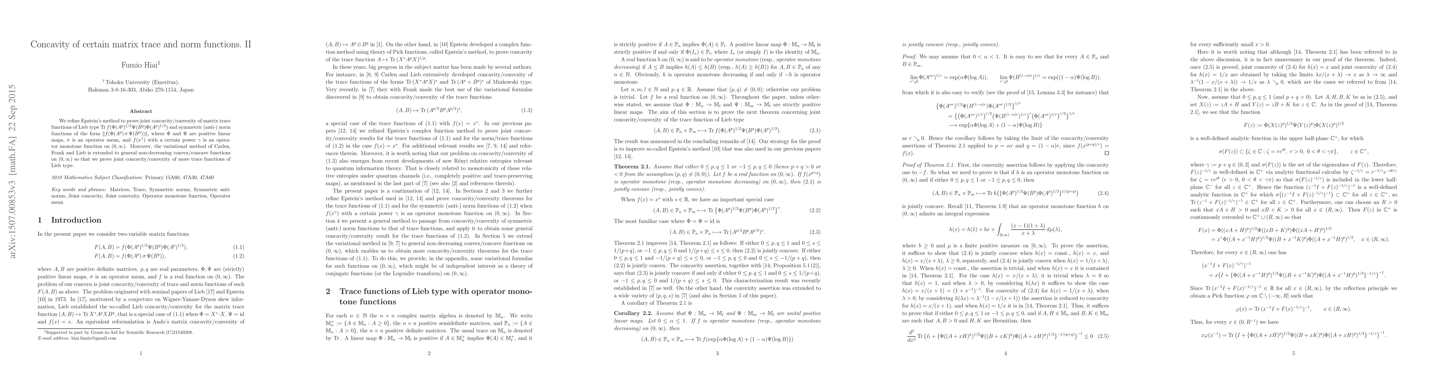 This paper refines Epstein's method to establish joint concavity/convexity of matrix trace functions of Lieb type and symmetric norm functions, using positive linear maps and operator monotone functions. It extends the variational method of Carlen, Frank, and Lieb to prove concavity/convexity for a broader class of trace functions.