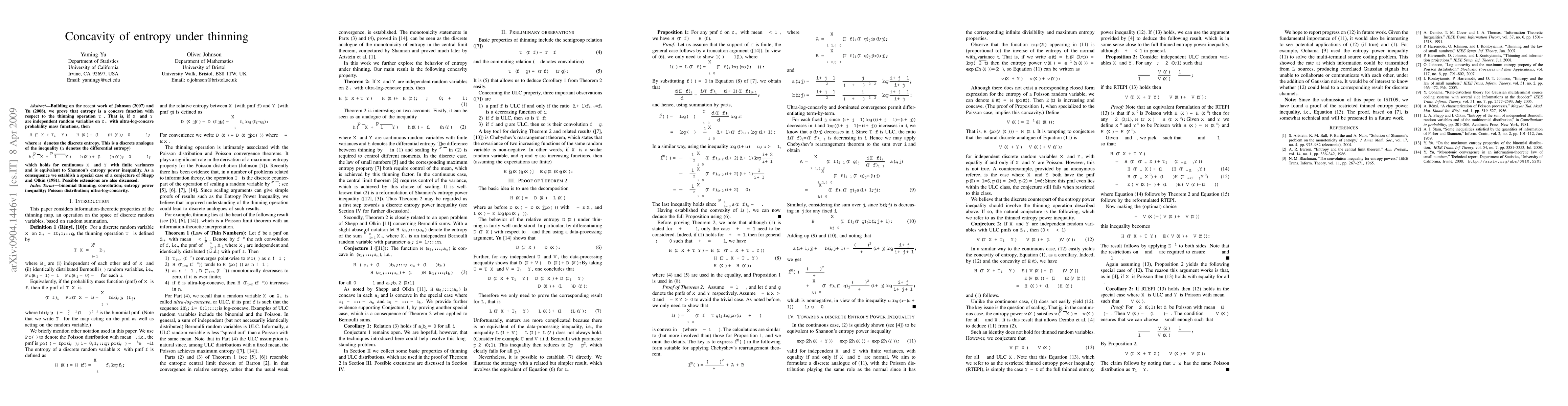 This paper proves that entropy is a concave function under the thinning operation T_a for independent random variables with ultra-log-concave probability mass functions, establishing a discrete analogue of Shannon's entropy power inequality. This result supports a conjecture by Shepp and Olkin (1981).