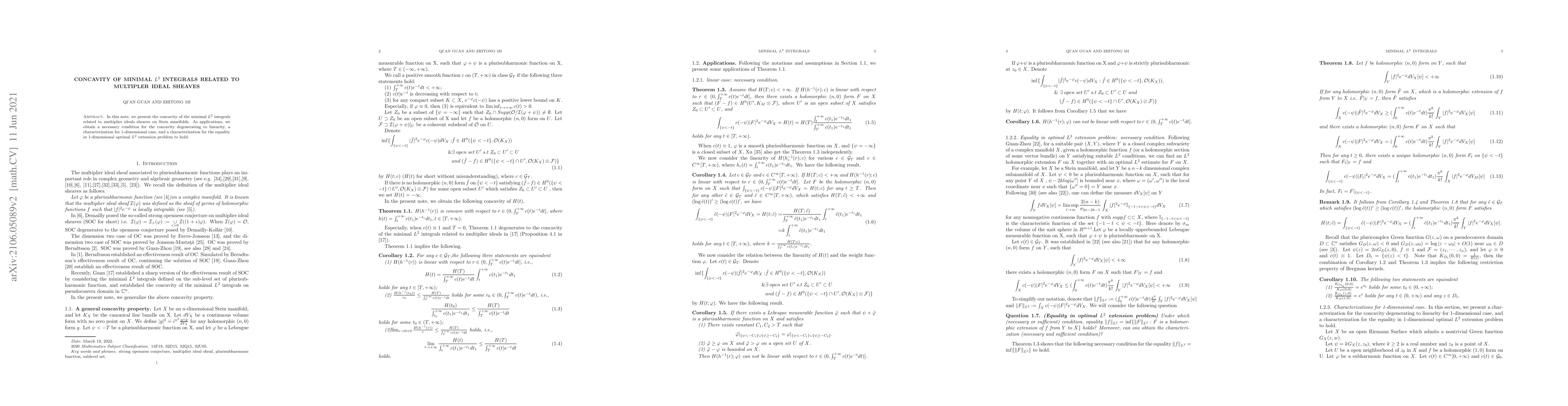 In this note, we present the concavity of the minimal $L^2$ integrals related to multiplier ideals sheaves on Stein manifolds. As applications, we obtain a necessary condition for the concavity degenerating to linearity, a characterization for 1-dimensional case, and a characterization for the equality in 1-dimensional optimal $L^{2}$ extension problem to hold.