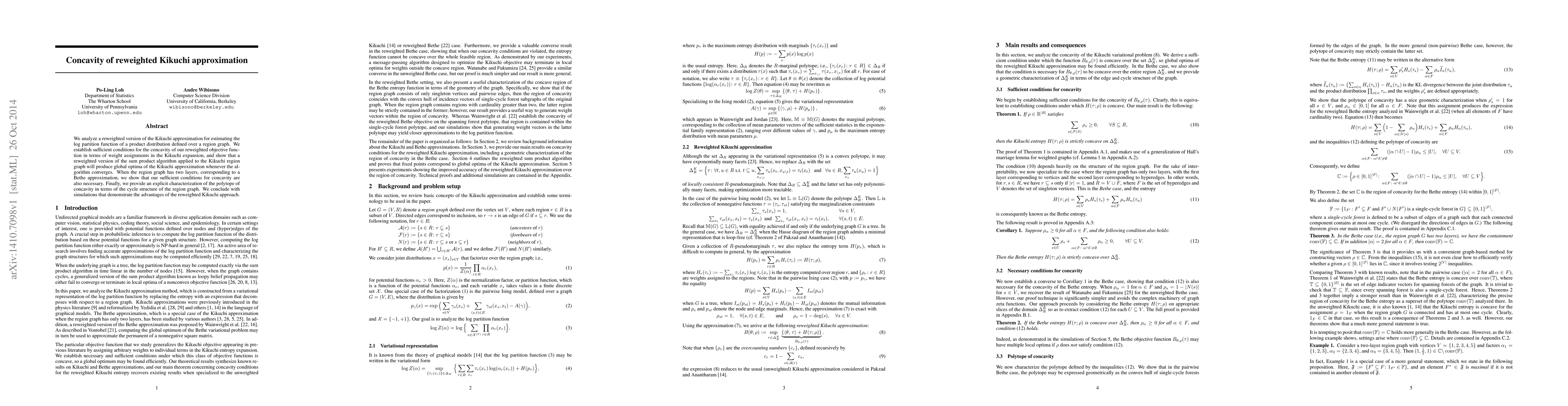 This paper investigates a reweighted version of the Kikuchi approximation for estimating the log partition function, establishing sufficient conditions for concavity and demonstrating that it yields global optima when applied to the sum product algorithm. It also shows that these conditions are necessary for two-layer region graphs, corresponding to Bethe approximation, and provides a characterization of the concavity polytope based on the region graph's cycle structure.