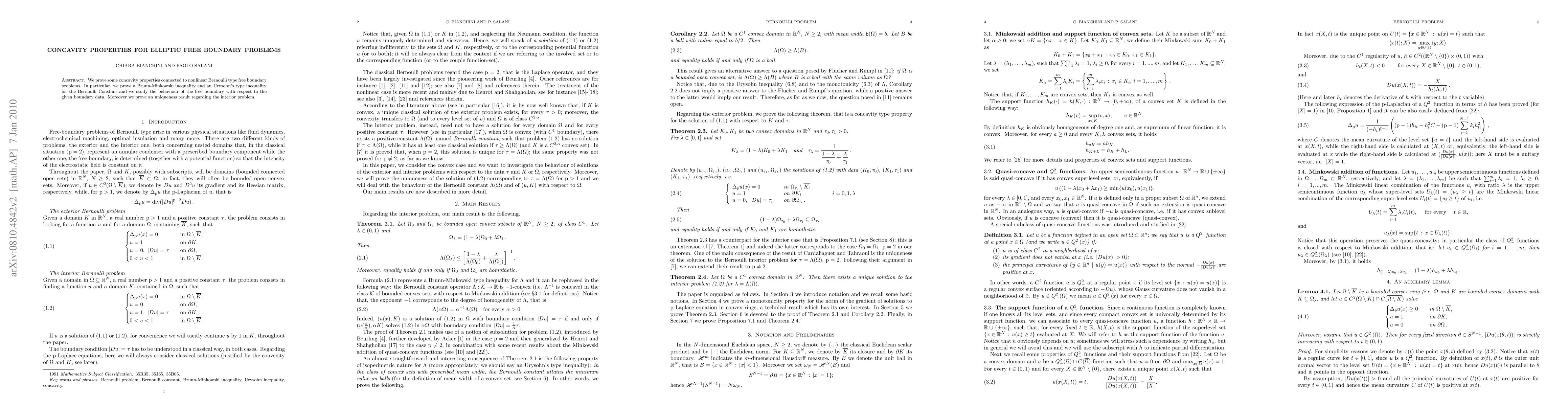 Researchers prove concavity properties for free boundary elliptic problems, including a Brunn-Minkowski inequality and uniqueness results, in nonlinear Bernoulli type problems with specific boundary conditions.