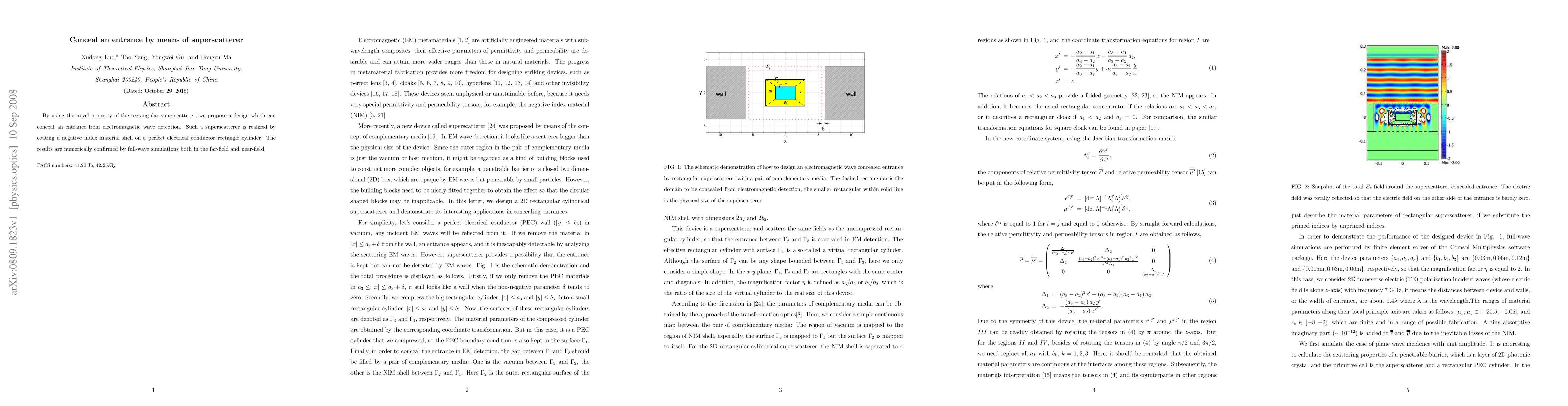 By using the novel property of the rectangular superscatterer, we propose a design which can conceal an entrance from electromagnetic wave detection. Such a superscatterer is realized by coating a negative index material shell on a perfect electrical conductor rectangle cylinder. The results are numerically confirmed by full-wave simulations both in the far-field and near-field.
