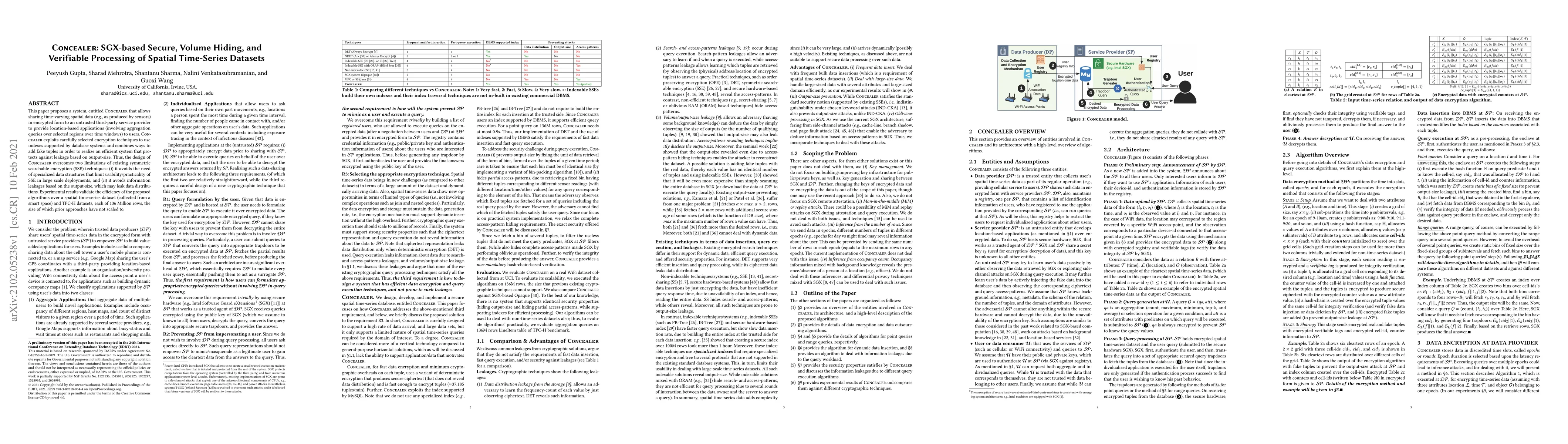 This paper proposes a system, entitled Concealer that allows sharing time-varying spatial data (e.g., as produced by sensors) in encrypted form to an untrusted third-party service provider to provide location-based applications (involving aggregation queries over selected regions over time windows) to users. Concealer exploits carefully selected encryption techniques to use indexes supported by database systems and combines ways to add fake tuples in order to realize an efficient system that protects against leakage based on output-size. Thus, the design of Concealer overcomes two limitations of existing symmetric searchable encryption (SSE) techniques: (i) it avoids the need of specialized data structures that limit usability/practicality of SSE in large scale deployments, and (ii) it avoids information leakages based on the output-size, which may leak data distributions. Experimental results validate the efficiency of the proposed algorithms over a spatial time-series dataset (collected from a smart space) and TPC-H datasets, each of 136 Million rows, the size of which prior approaches have not scaled to.