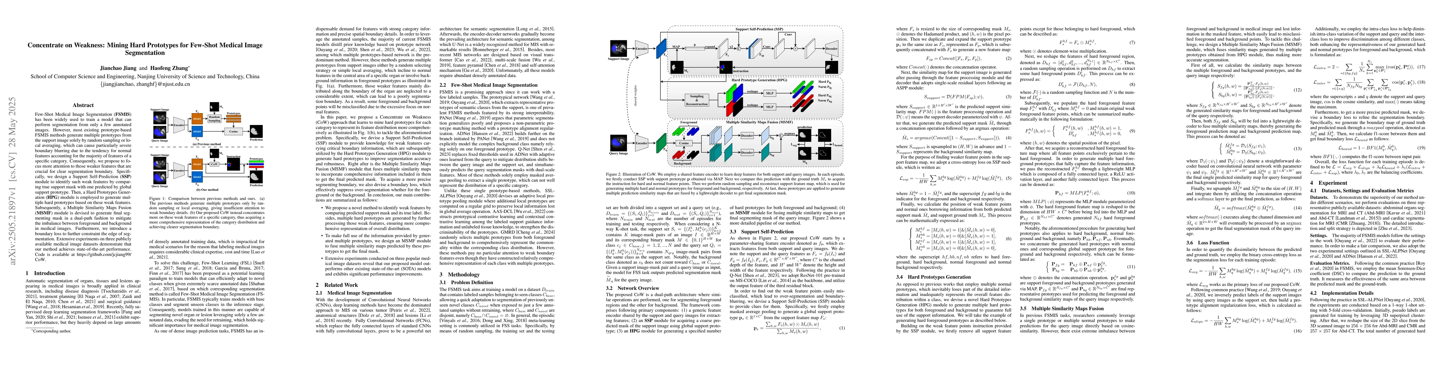 Few-Shot Medical Image Segmentation (FSMIS) has been widely used to train a model that can perform segmentation from only a few annotated images. However, most existing prototype-based FSMIS methods generate multiple prototypes from the support image solely by random sampling or local averaging, which can cause particularly severe boundary blurring due to the tendency for normal features accounting for the majority of features of a specific category. Consequently, we propose to focus more attention to those weaker features that are crucial for clear segmentation boundary. Specifically, we design a Support Self-Prediction (SSP) module to identify such weak features by comparing true support mask with one predicted by global support prototype. Then, a Hard Prototypes Generation (HPG) module is employed to generate multiple hard prototypes based on these weak features. Subsequently, a Multiple Similarity Maps Fusion (MSMF) module is devised to generate final segmenting mask in a dual-path fashion to mitigate the imbalance between foreground and background in medical images. Furthermore, we introduce a boundary loss to further constraint the edge of segmentation. Extensive experiments on three publicly available medical image datasets demonstrate that our method achieves state-of-the-art performance. Code is available at https://github.com/jcjiang99/CoW.