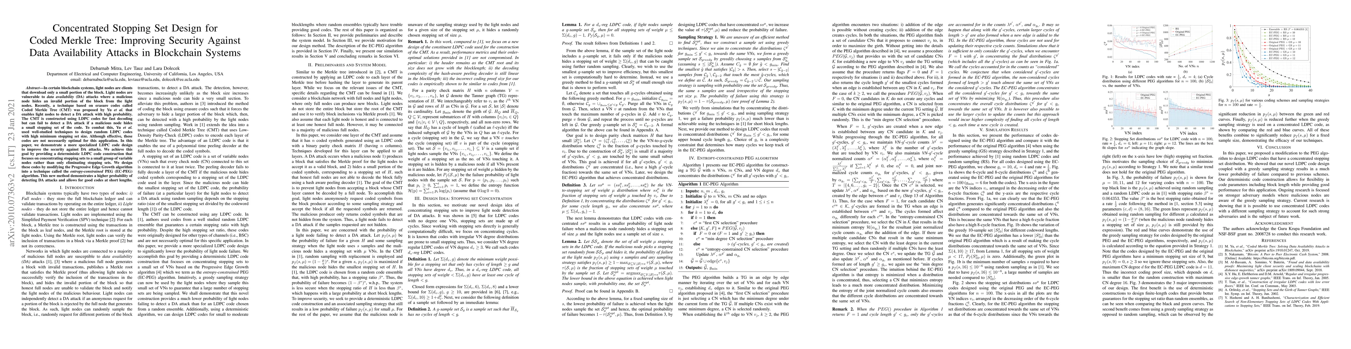 This paper presents a specialized LDPC code design for Coded Merkle Trees to enhance security against data availability attacks in blockchain systems by concentrating stopping sets. The proposed entropy-constrained PEG (EC-PEG) algorithm achieves a higher detection probability for attacks compared to traditional methods.