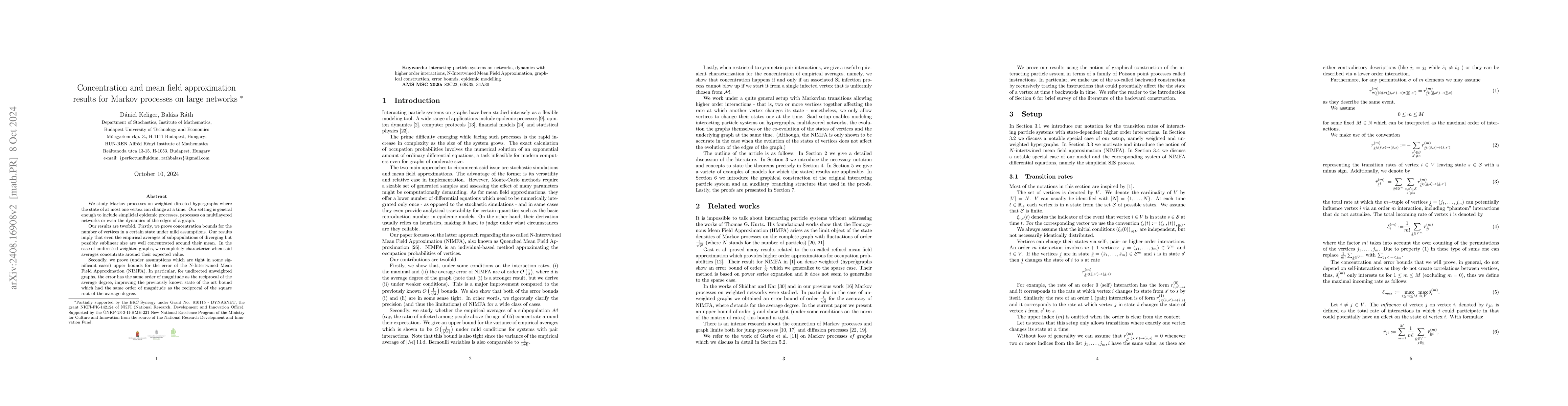 We study Markov processes on weighted directed hypergraphs where the state of at most one vertex can change at a time. Our setting is general enough to include simplicial epidemic processes, processes on multilayered networks or even the dynamics of the edges of a graph. Our results are twofold. Firstly, we prove concentration bounds for the number of vertices in a certain state under mild assumptions. Our results imply that even the empirical averages of subpopulations of diverging but possibly sublinear size are well concentrated around their mean. In the case of undirected weighted graphs, we completely characterize when said averages concentrate around their expected value. Secondly, we prove (under assumptions which are tight in some significant cases) upper bounds for the error of the N-Intertwined Mean Field Approximation (NIMFA). In particular, for symmetric unweighted graphs, the error has the same order of magnitude as the reciprocal of the average degree, improving the previously known state of the art bound of the inverse square root of the average degree.