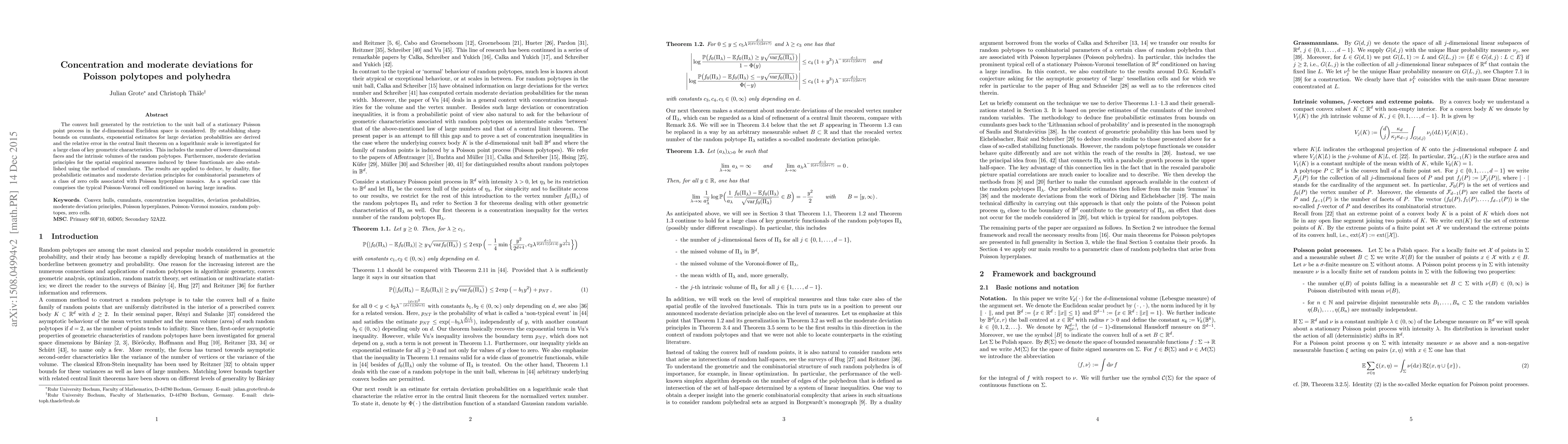 This paper investigates the geometric properties of Poisson polytopes, deriving sharp bounds on cumulants and establishing exponential estimates for large deviation probabilities. It also explores moderate deviation principles for key geometric characteristics and applies these results to zero cells in Poisson hyperplane mosaics.
