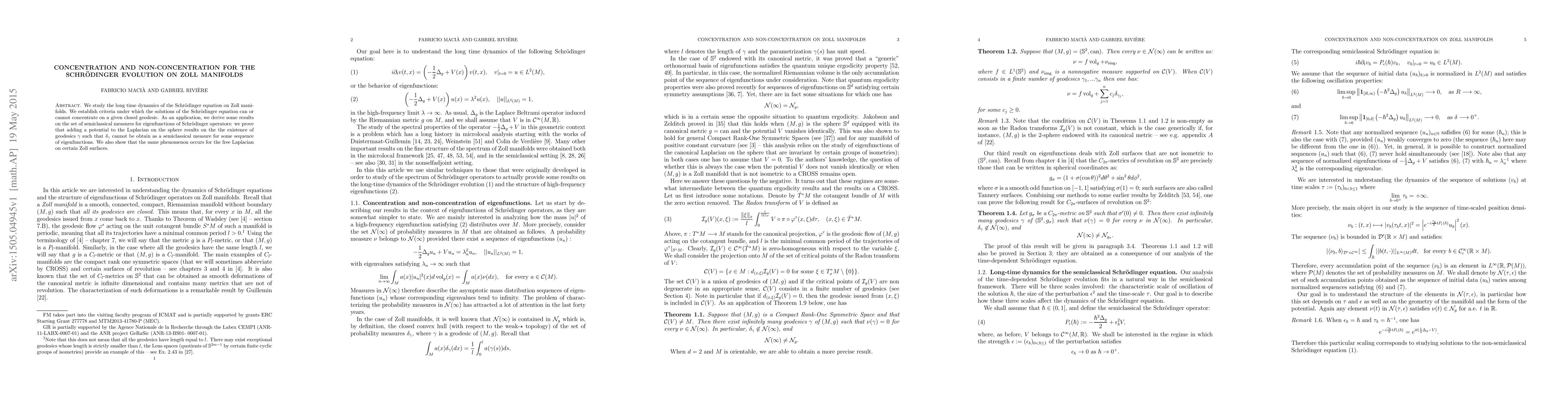 This paper investigates the long-time dynamics of the Schrödinger equation on Zoll manifolds, establishing criteria for concentration or non-concentration of solutions on closed geodesics. It demonstrates that adding a potential to the Laplacian on the sphere can prevent certain geodesics from being semiclassical measures for eigenfunctions, a phenomenon also observed in the free Laplacian on specific Zoll surfaces.