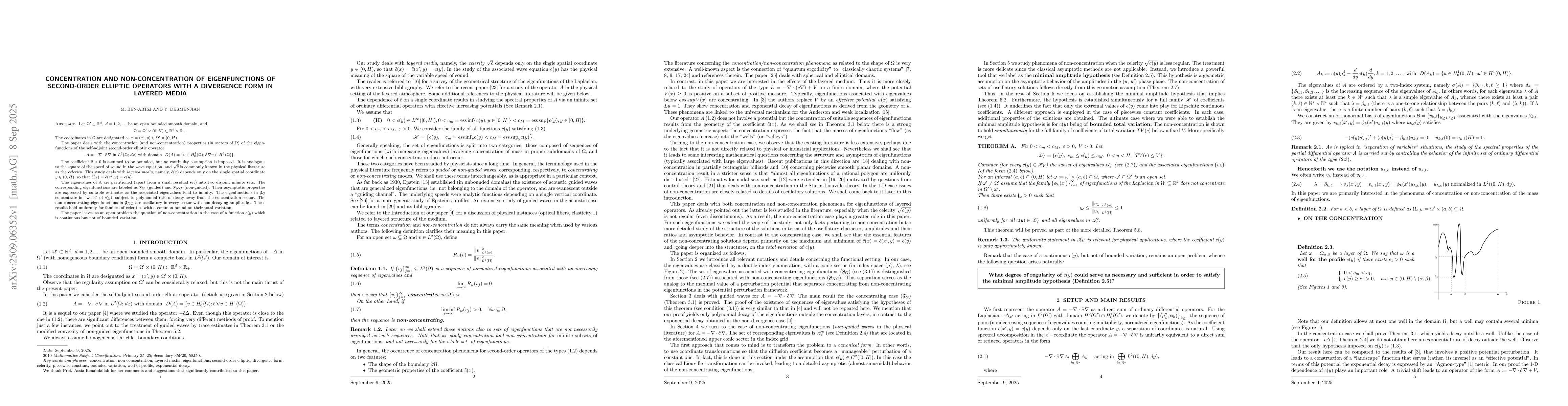 Let $\Omega$ ' $\subset$ R^d , d = 1, 2, . . . be an open bounded smooth domain, and $\Omega = \Omega'\times (0,H)\subset \mathbb{R}^d \times \mathbb{R}_+.$ The coordinates in $\Omega$ are designated as x = (x ' , y) $\in$ $\Omega$ ' x (0, H). The paper deals with the concentration (and non-concentration) properties (in sectors of $\Omega$) of the eigenfunctions of the self-adjoint second-order elliptic operator $A = -\nabla\cdot\tilde{c}\nabla$ in $L^2(\Omega,dx)$ with domain $D(A) = \{v\in H_0^1(\Omega); \tilde{c}\nabla v \in H^1(\Omega)\}.$ The coefficient $\tilde{c}>0$ is assumed to be bounded, but no continuity assumption is imposed. It is analogous to the square of the speed of sound in the wave equation, and $\square{\tilde{c}}$ is commonly known in the physical literature as the celerity. This study deals with layered media, namely, $\tilde{c}(x)$) depends only on the single spatial coordinate y $\in$ (0, H), so that $\tilde{c}(x) = \tilde{c}(x ' , y) = c(y).$ The eigenvalues of A are partitioned (apart from a small residual set) into two disjoint infinite sets. The corresponding eigenfunctions are labeled as $F_G$ (guided) and $F_{N G}$ (non-guided). Their asymptotic properties are expressed by suitable estimates as the associated eigenvalues tend to infinity. The eigenfunctions in $F_G$ concentrate in ''wells'' of $c(y),$ subject to polynomial rate of decay away from the concentration sector. The non-concentrating eigenfunctions in $F_{N G}$ are oscillatory in every sector with non-decaying amplitudes. These results hold uniformly for families of celerities with a common bound on their total variation. The paper leaves as an open problem the question of non-concentration in the case of a function $\tilde{c}y)$ which is continuous but not of bounded variation.
