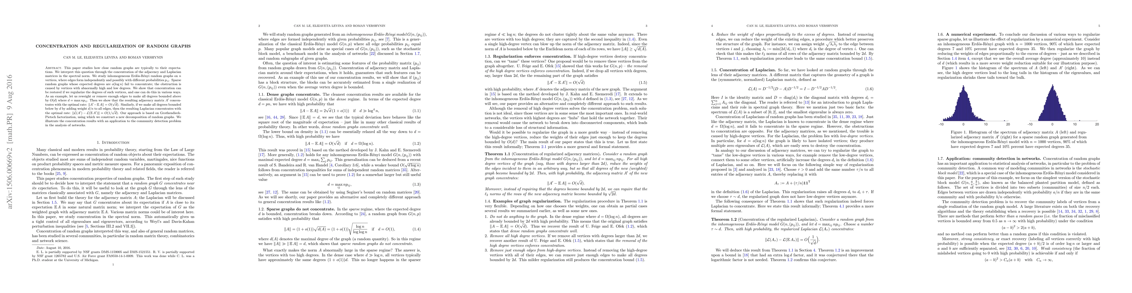 This paper studies how close random graphs are typically to their expectations. We interpret this question through the concentration of the adjacency and Laplacian matrices in the spectral norm. We study inhomogeneous Erd\"os-R\'enyi random graphs on $n$ vertices, where edges form independently and possibly with different probabilities $p_{ij}$. Sparse random graphs whose expected degrees are $o(\log n)$ fail to concentrate; the obstruction is caused by vertices with abnormally high and low degrees. We show that concentration can be restored if we regularize the degrees of such vertices, and one can do this in various ways. As an example, let us reweight or remove enough edges to make all degrees bounded above by $O(d)$ where $d=\max np_{ij}$. Then we show that the resulting adjacency matrix $A'$ concentrates with the optimal rate: $\|A' - \mathbb{E} A\| = O(\sqrt{d})$. Similarly, if we make all degrees bounded below by $d$ by adding weight $d/n$ to all edges, then the resulting Laplacian concentrates with the optimal rate: $\|L(A') - L(\mathbb{E} A')\| = O(1/\sqrt{d})$. Our approach is based on Grothendieck-Pietsch factorization, using which we construct a new decomposition of random graphs. We illustrate the concentration results with an application to the community detection problem in the analysis of networks.