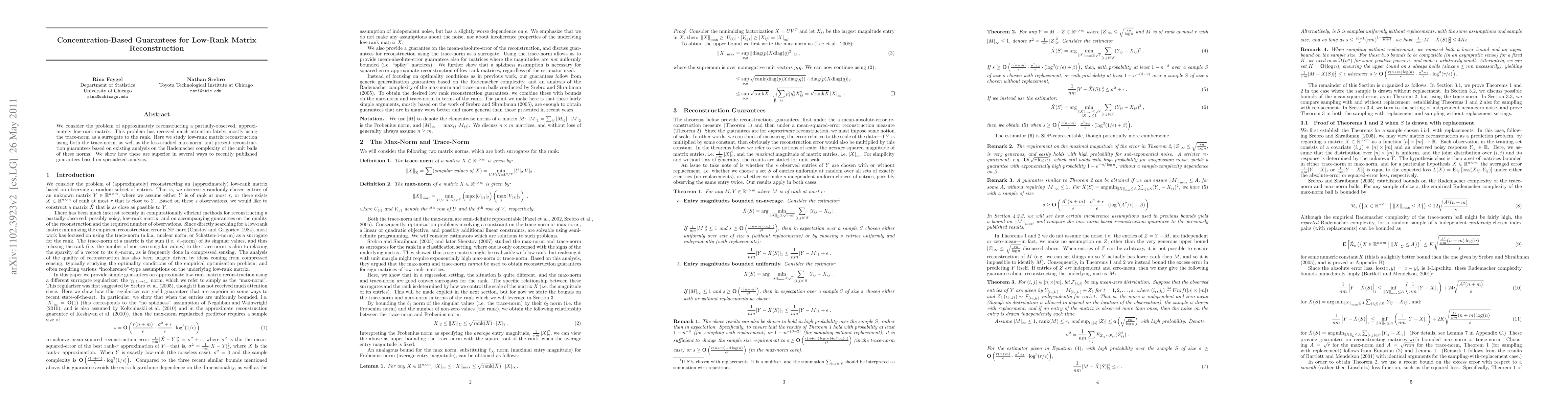 This paper explores the reconstruction of partially-observed, low-rank matrices using both trace-norm and max-norm, presenting superior concentration-based guarantees based on Rademacher complexity analysis, outperforming recent methods.