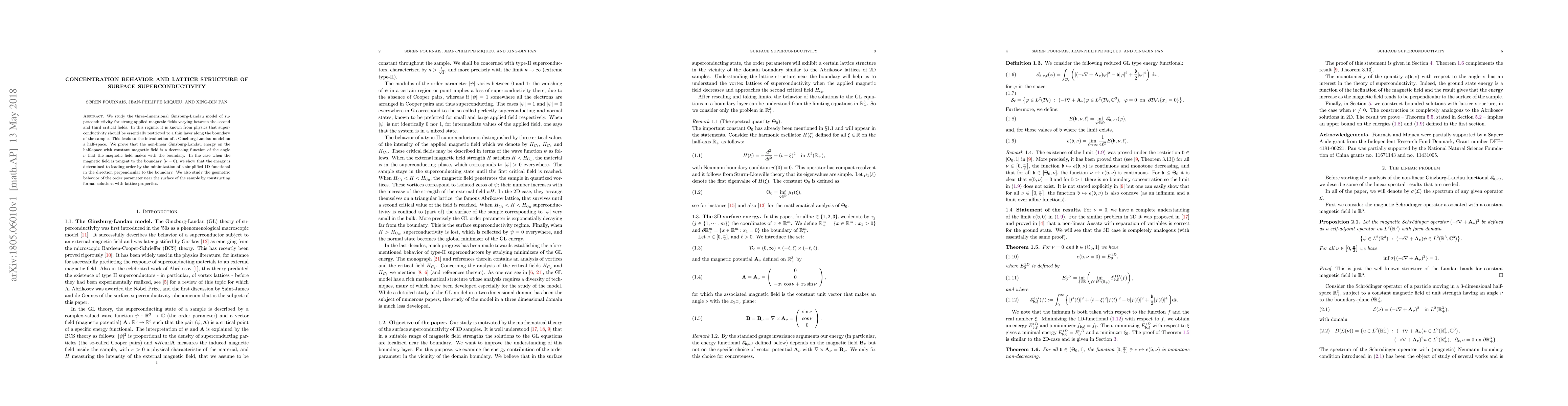 This paper investigates the three-dimensional Ginzburg-Landau model for superconductivity in strong magnetic fields, focusing on the behavior near the surface. It proves that the energy decreases as the angle between the magnetic field and the boundary increases, and when the field is tangent to the boundary, the energy is minimized by a simplified 1D functional. Additionally, it explores the geometric behavior of the order parameter with lattice structures near the surface.