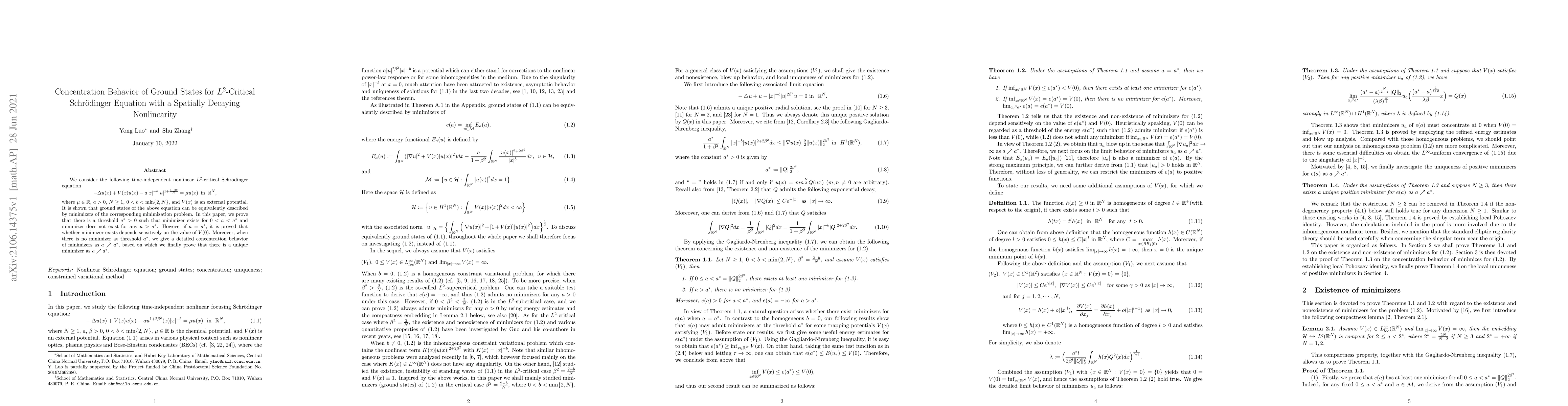 This paper investigates the concentration behavior of ground states for the $L^2$-critical Schrödinger equation with a spatially decaying nonlinearity. It proves the existence of a threshold $a^*$ such that minimizers exist for $0 < a < a^*$ but not for $a > a^*$, with the existence at $a = a^*$ depending on $V(0)$. It also details the concentration behavior of minimizers as $a$ approaches $a^*$, ultimately proving the existence of a unique minimizer as $a$ approaches $a^*$.