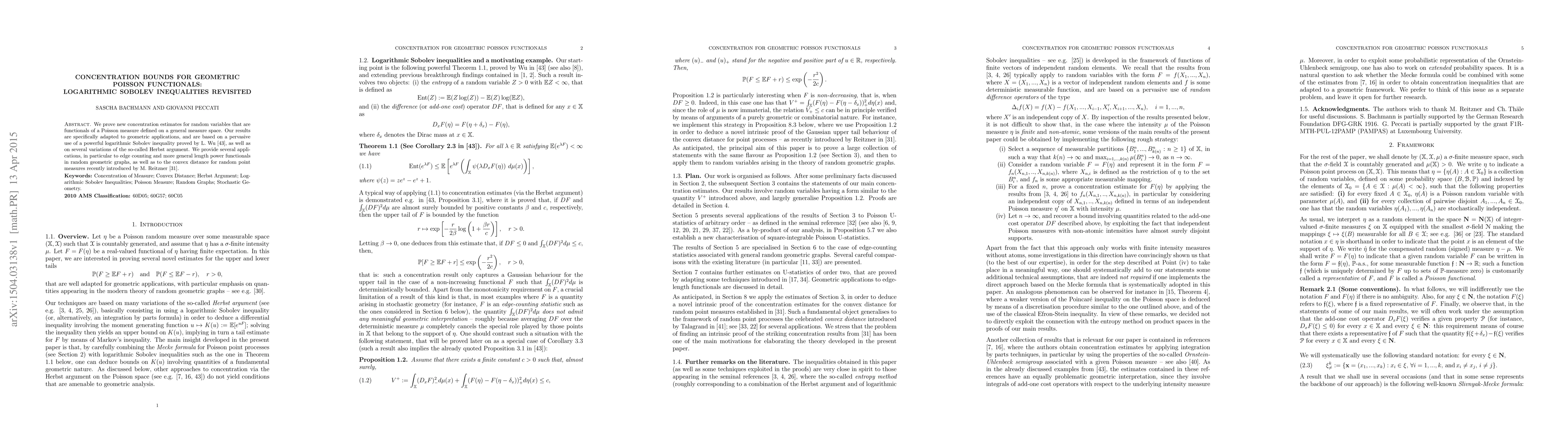 This paper presents new concentration bounds for random variables derived from geometric Poisson functionals, utilizing a logarithmic Sobolev inequality by L. Wu and Herbst argument. It applies these results to edge counting and length power functionals in random geometric graphs, and the convex distance for random point measures.