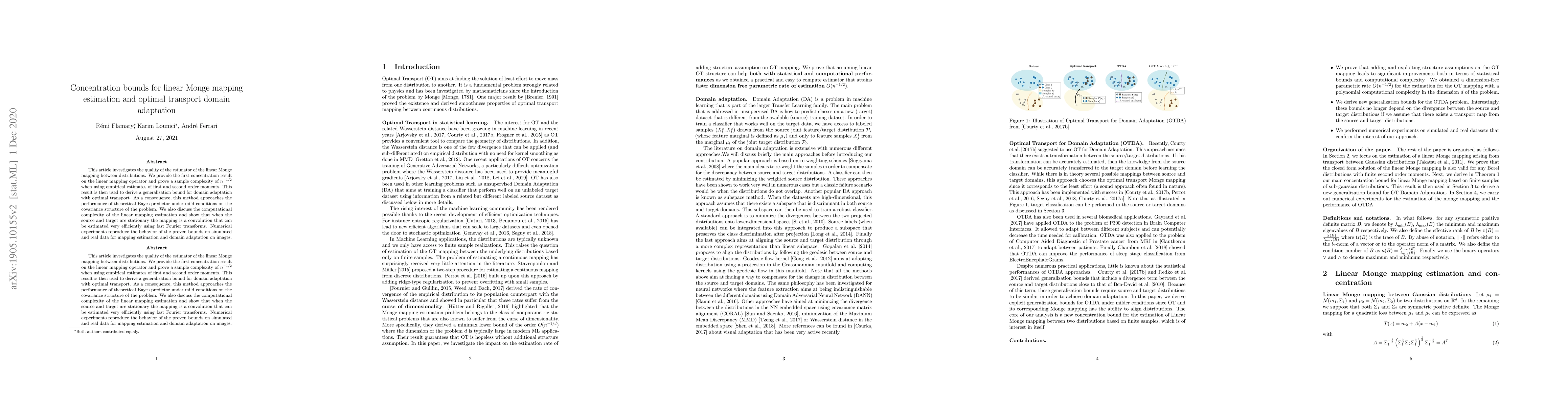 The paper presents the first concentration bound for the quality of a linear Monge mapping estimator, proves a $n^{-1/2}$ sample complexity, and derives a generalization bound for domain adaptation using optimal transport.