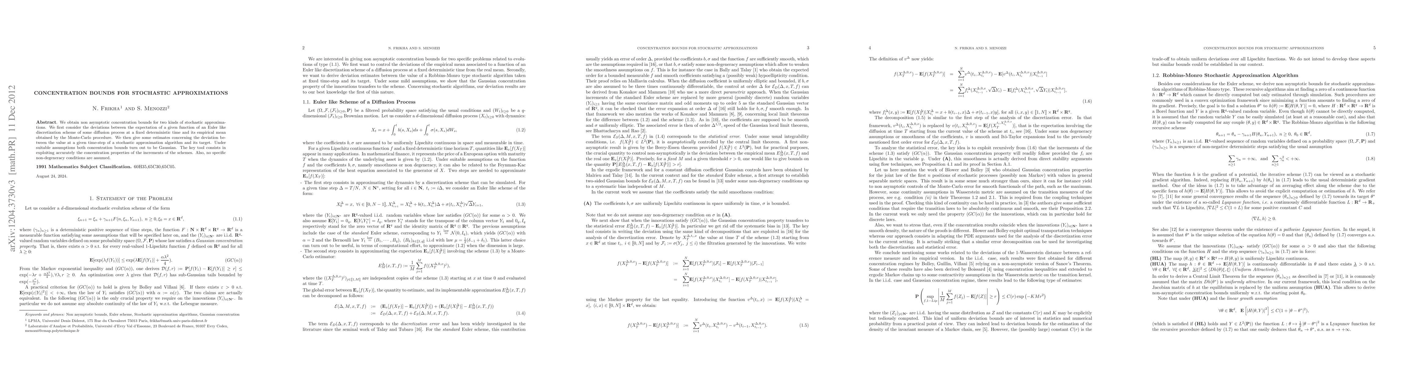 We obtain non asymptotic concentration bounds for two kinds of stochastic approximations. We first consider the deviations between the expectation of a given function of the Euler scheme of some diffusion process at a fixed deterministic time and its empirical mean obtained by the Monte-Carlo procedure. We then give some estimates concerning the deviation between the value at a given time-step of a stochastic approximation algorithm and its target. Under suitable assumptions both concentration bounds turn out to be Gaussian. The key tool consists in exploiting accurately the concentration properties of the increments of the schemes. For the first case, as opposed to the previous work of Lemaire and Menozzi (EJP, 2010), we do not have any systematic bias in our estimates. Also, no specific non-degeneracy conditions are assumed.