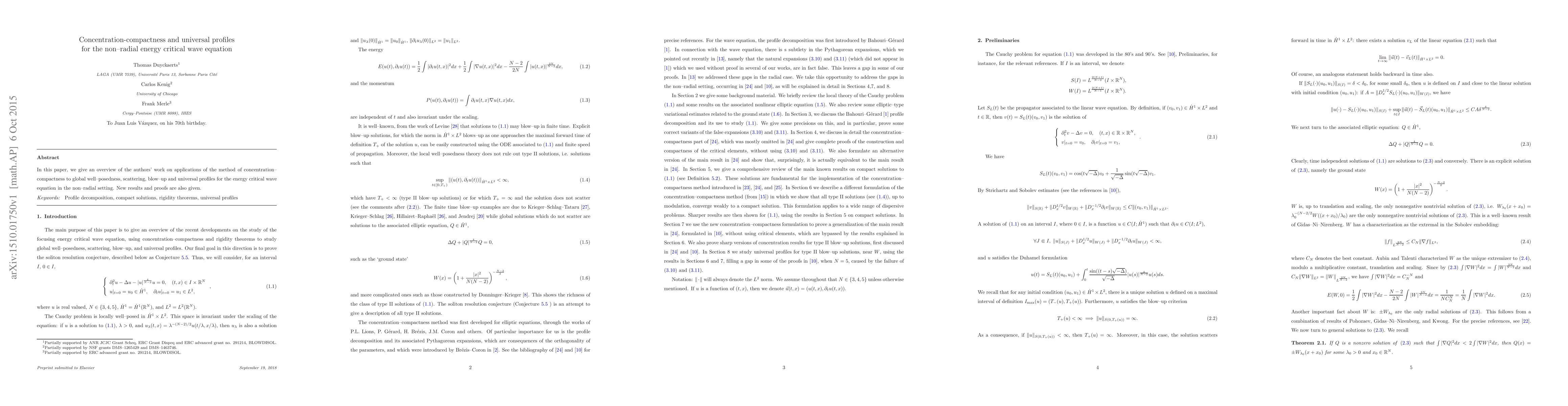 This paper explores the application of concentration-compactness to study global well-posedness, scattering, blow-up, and universal profiles for the non-radial energy critical wave equation, presenting new results and proofs.