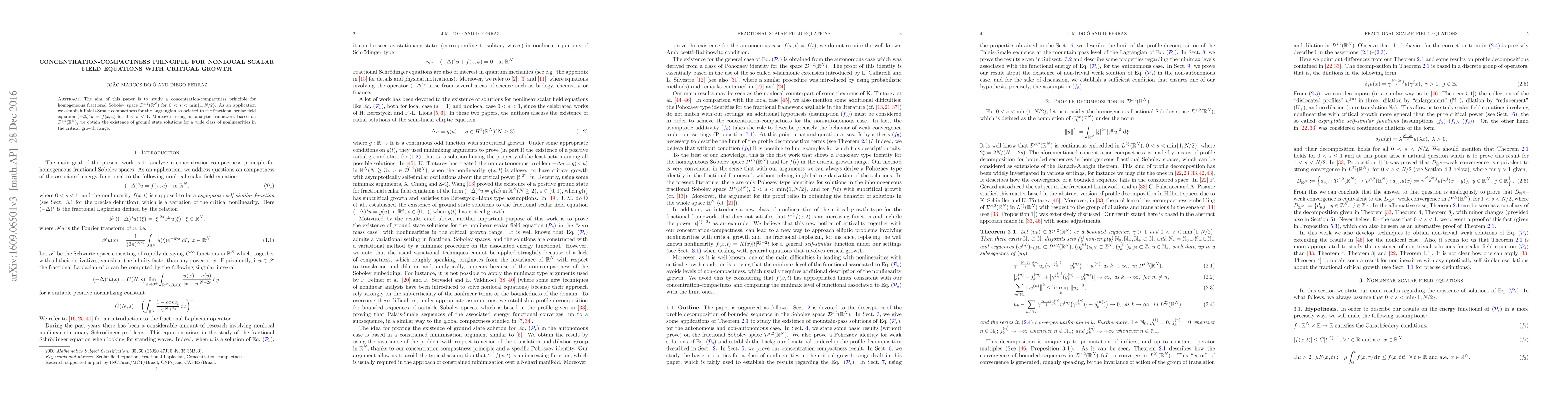 This paper develops a concentration-compactness principle for the fractional Sobolev space $\mathcal{D}^{s,2} (\mathbb{R}^N)$ and applies it to establish Palais-Smale compactness for the fractional scalar field equation $(-\Delta)^{s} u = f(x,u)$. It also proves the existence of ground state solutions for nonlinearities with critical growth.