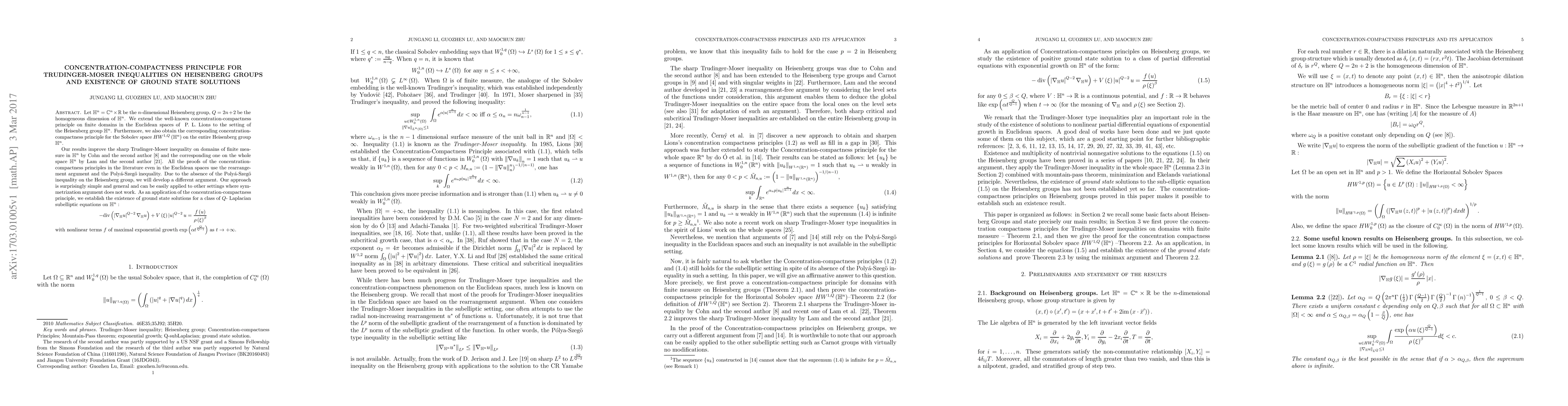 Let $\mathbb{H}^{n}=\mathbb{C}^{n}\times\mathbb{R}$ be the $n$-dimensional Heisenberg group, $Q=2n+2$ be the homogeneous dimension of $\mathbb{H}^{n}$. We extend the well-known concentration-compactness principle on finite domains in the Euclidean spaces of \ P. L. Lions to the setting of the Heisenberg group $\mathbb{H}^{n}$. Furthermore, we also obtain the corresponding concentration-compactness principle for the Sobolev space $HW^{1,Q}\left( \mathbb{H}^{n}\right) $ on the entire Heisenberg group $\mathbb{H}^{n}$. Our results improve the sharp Trudinger-Moser inequality on domains of finite measure in $\mathbb{H}^{n}$ by Cohn and the second author [8] and the corresponding one on the whole space $\mathbb{H}^n$ by Lam and the second author [21]. All the proofs of the concentration-compactness principles in the literature even in the Euclidean spaces use the rearrangement argument and the Poly\'a-Szeg\"{o} inequality. Due to the absence of the Poly\'a-Szeg\"{o} inequality on the Heisenberg group, we will develop a different argument. Our approach is surprisingly simple and general and can be easily applied to other settings where symmetrization argument does not work. As an application of the concentration-compactness principle, we establish the existence of ground state solutions for a class of $Q$- Laplacian subelliptic equations on $\mathbb{H}^{n}$ with nonlinear terms $f$ of maximal exponential growth $\exp\left( \alpha t^{\frac{Q}{Q-1}}\right) $ as $t\rightarrow+\infty$.