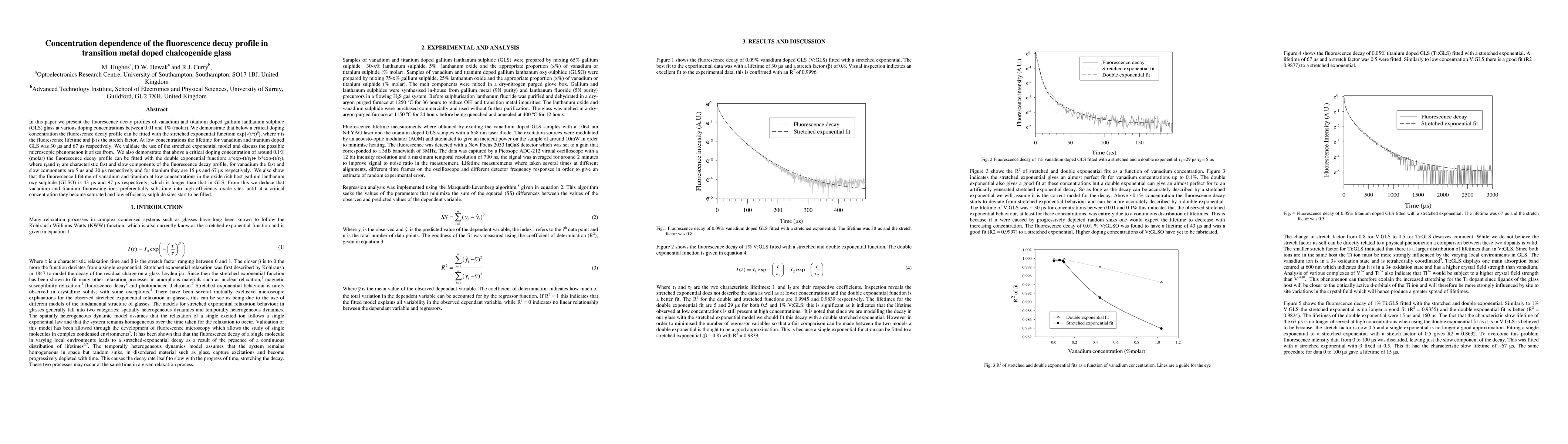 This research examines fluorescence decay profiles in vanadium and titanium doped gallium lanthanum sulphide (GLS) glass. It finds that below 0.1% (molar) doping, the decay fits a stretched exponential model, while above this, a double exponential model applies. The study also reveals that vanadium and titanium ions prefer oxide sites over sulphide sites in the GLS host, with lifetimes changing accordingly in an oxide-rich variant, GLSO.