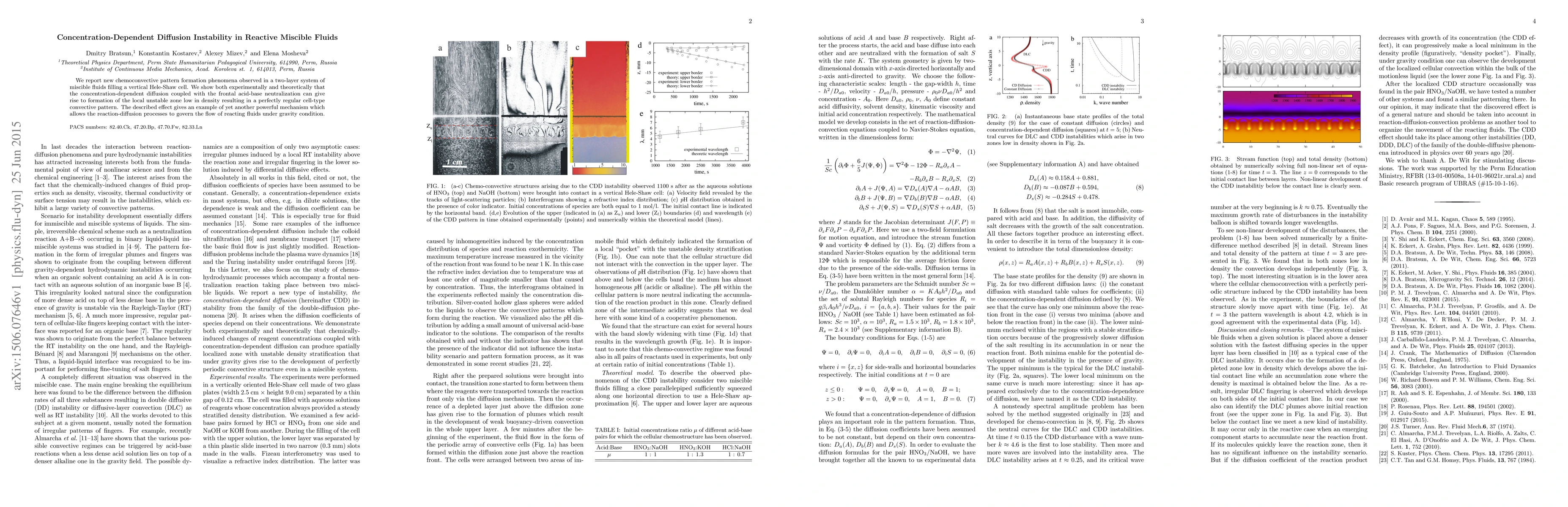 This paper investigates the chemoconvective pattern formation in miscible fluids within a vertical Hele-Shaw cell, demonstrating experimentally and theoretically that concentration-dependent diffusion and frontal acid-base neutralization can create a local unstable zone, leading to a regular cell-type convective pattern, highlighting a new mechanism for reaction-diffusion processes in gravity-driven fluid flow.