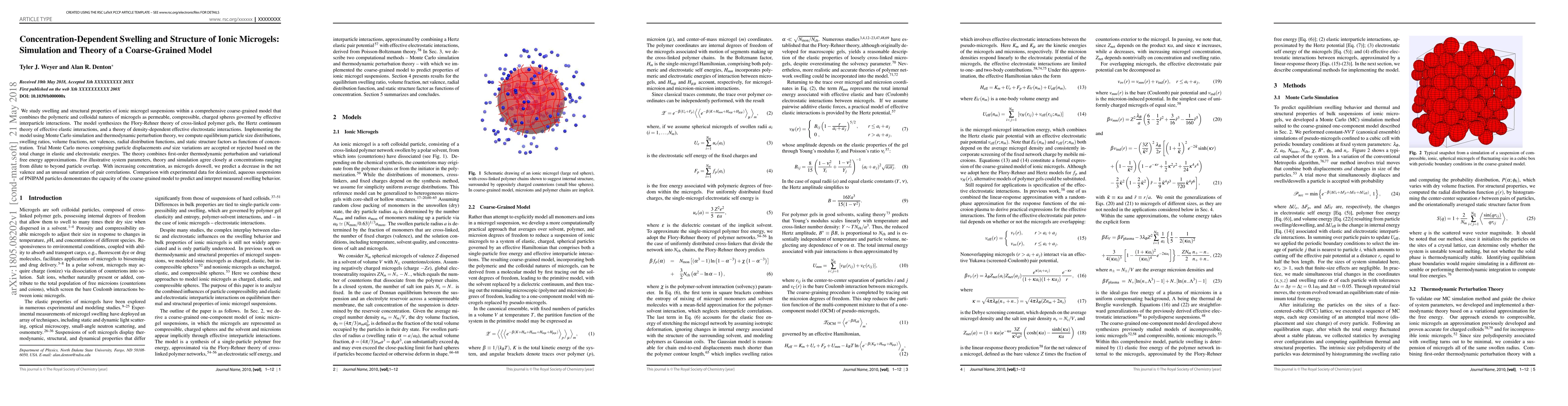 We study swelling and structural properties of ionic microgel suspensions within a comprehensive coarse-grained model that combines the polymeric and colloidal natures of microgels as permeable, compressible, charged spheres governed by effective interparticle interactions. The model synthesizes the Flory-Rehner theory of cross-linked polymer gels, the Hertz continuum theory of effective elastic interactions, and a theory of density-dependent effective electrostatic interactions. Implementing the model using Monte Carlo simulation and thermodynamic perturbation theory, we compute equilibrium particle size distributions, swelling ratios, volume fractions, net valences, radial distribution functions, and static structure factors as functions of concentration. Trial Monte Carlo moves comprising particle displacements and size variations are accepted or rejected based on the total change in elastic and electrostatic energies. The theory combines first-order thermodynamic perturbation and variational free energy approximations. For illustrative system parameters, theory and simulation agree closely at concentrations ranging from dilute to beyond particle overlap. With increasing concentration, as microgels deswell, we predict a decrease in the net valence and an unusual saturation of pair correlations. Comparison with experimental data for deionized, aqueous suspensions of PNIPAM particles demonstrates the capacity of the coarse-grained model to predict and interpret measured swelling behavior.