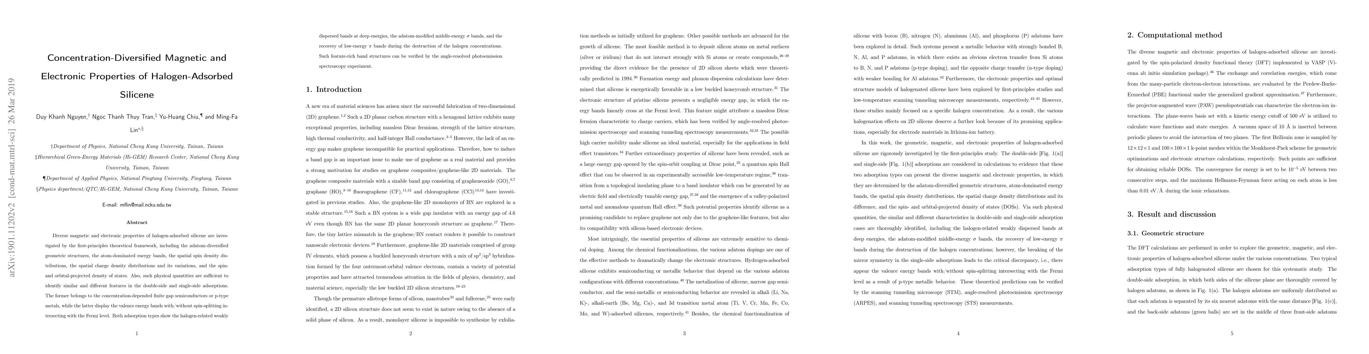Diverse magnetic and electronic properties of halogen-adsorbed silicene are investigated by the first-principles theoretical framework, including the adatom-diversified geometric structures, the atom-dominated energy bands, the spatial spin density distributions, the spatial charge density distributions and its variations, and the spin- and orbital-projected density of states. Also, such physical quantities are sufficient to identify similar and different features in the double-side and single-side adsorptions. The former belongs to the concentration-depended finite gap semiconductors or p-type metals, while the latter display the valence energy bands with/without spin-splitting intersecting with the Fermi level. Both adsorption types show the halogen-related weakly dispersed bands at deep energies, the adatom-modified middle-energy sigma bands, and the recovery of low-energy pi bands during the destruction of the halogen concentrations. Such feature-rich band structures can be verified by the angle-resolved photoemission spectroscopy experiment.