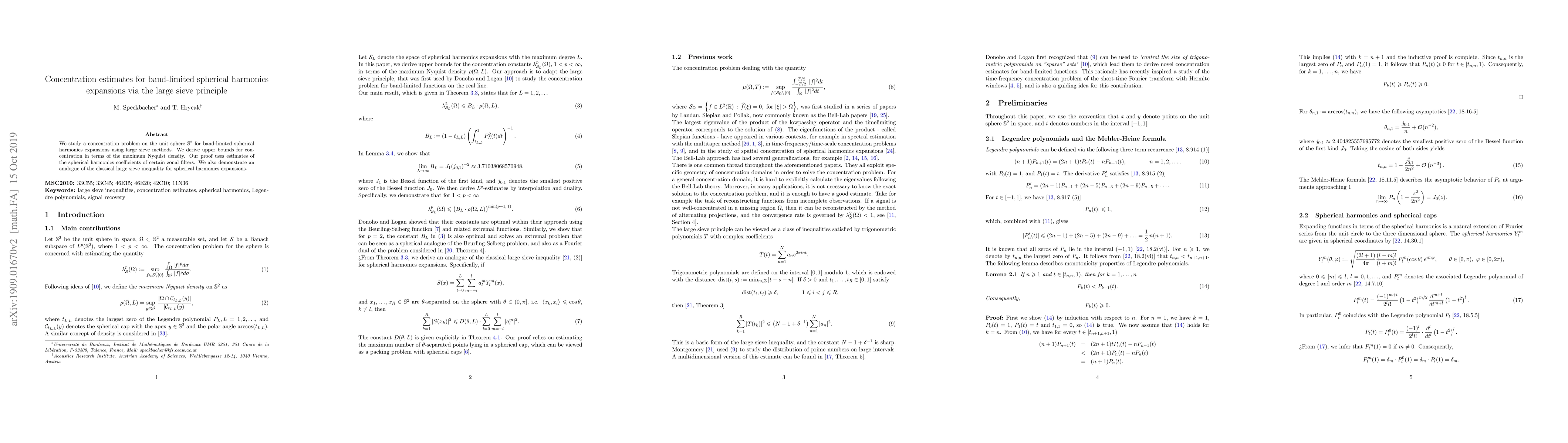 This paper investigates concentration bounds for band-limited spherical harmonics expansions on the unit sphere using the large sieve principle, deriving upper bounds linked to the maximum Nyquist density, and proving an analogue of the classical large sieve inequality for these expansions.